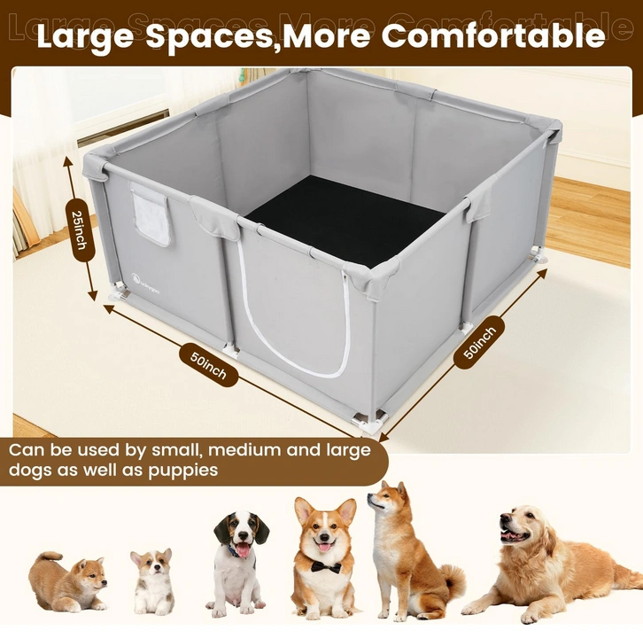 There’s plenty of room for the mother and puppies to rest together. The 25-inch height helps keep puppies safely contained while still allowing easy access for the mother. One side features a smooth zipper door that can be opened or secured at the top for convenient entry and exit.