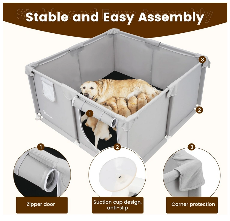The bottom suction cups help keep the box in place, preventing shifting or tipping. It can also be used beyond whelping as a playpen or recovery area, helping keep your space clean and organized.