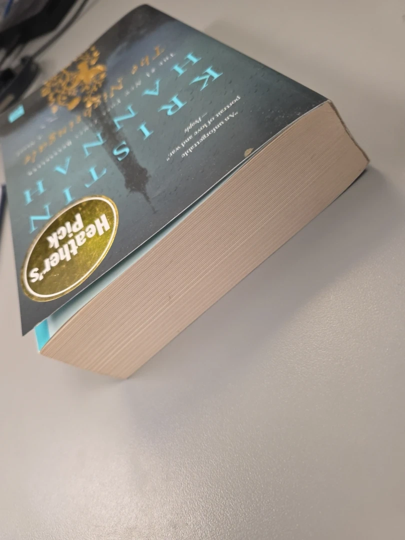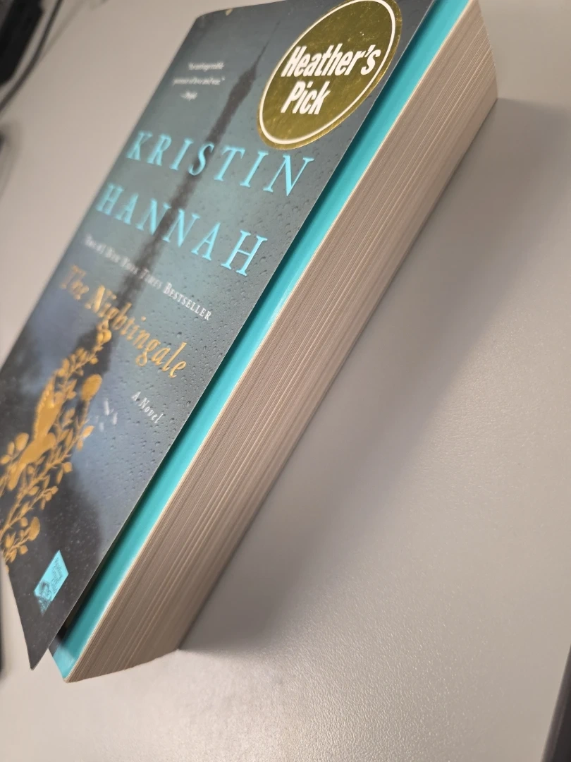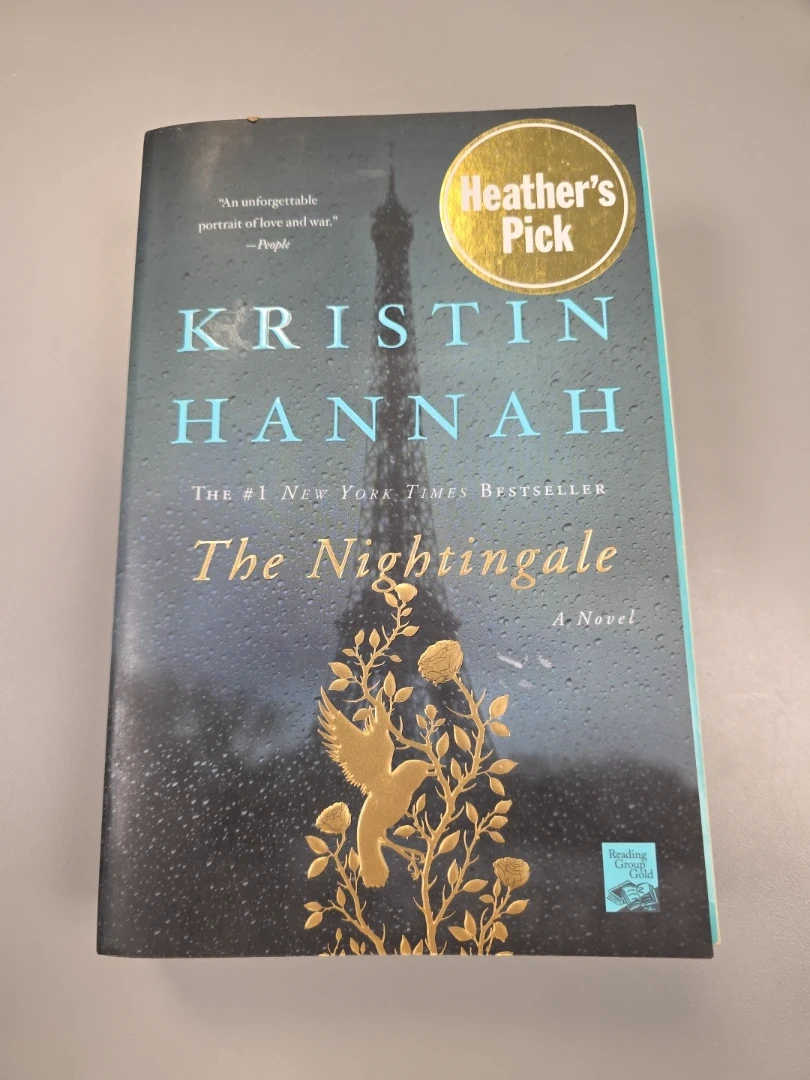 This is Kristin Hannah's The Nightingale, a New York Times bestseller. It's a novel about two sisters in France during World War II. The book received 'Heather's Pick' and has numerous other accolades.
