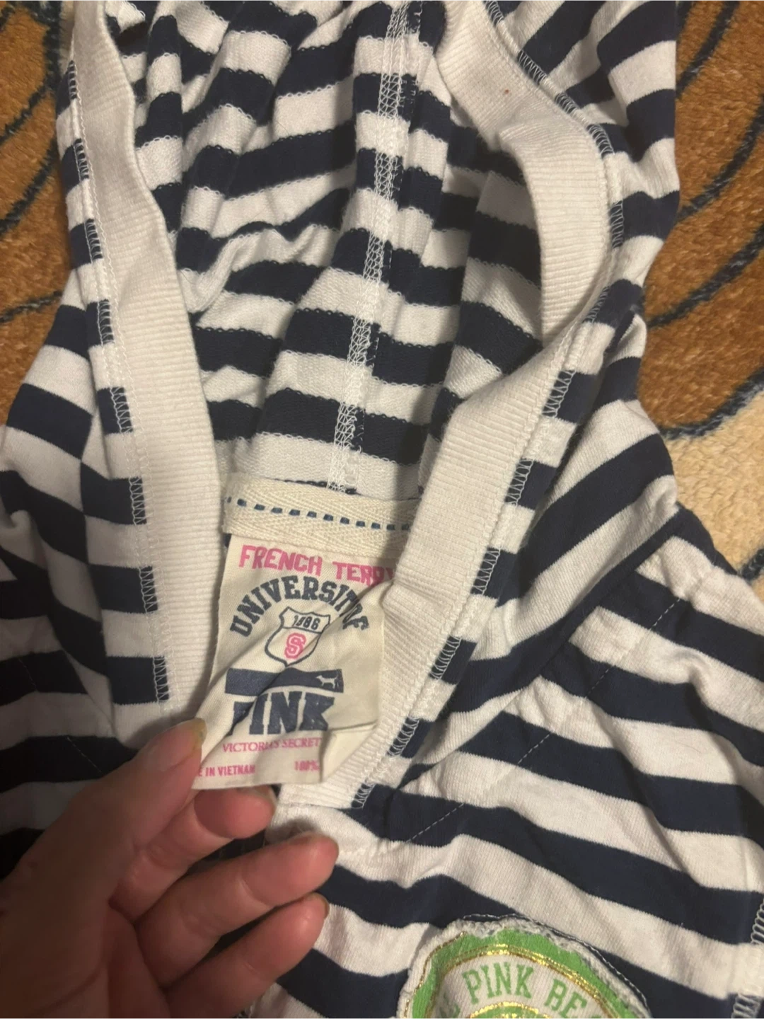 Victoria's Secret PINK French Terry zip-up hoodie with navy and white stripes. It's a comfortable, hooded jacket. Includes a patch on the chest and ribbed cuffs and hem.