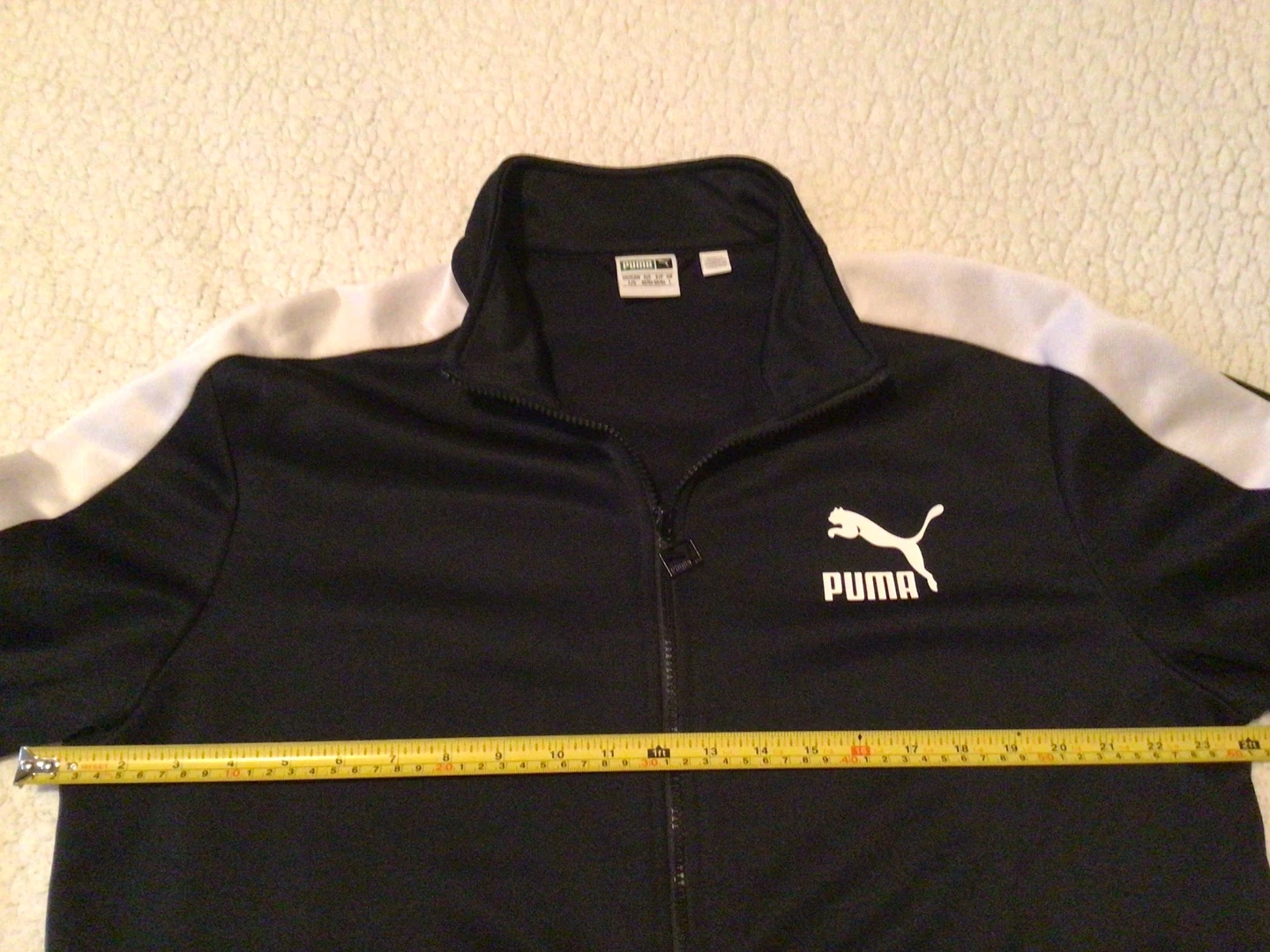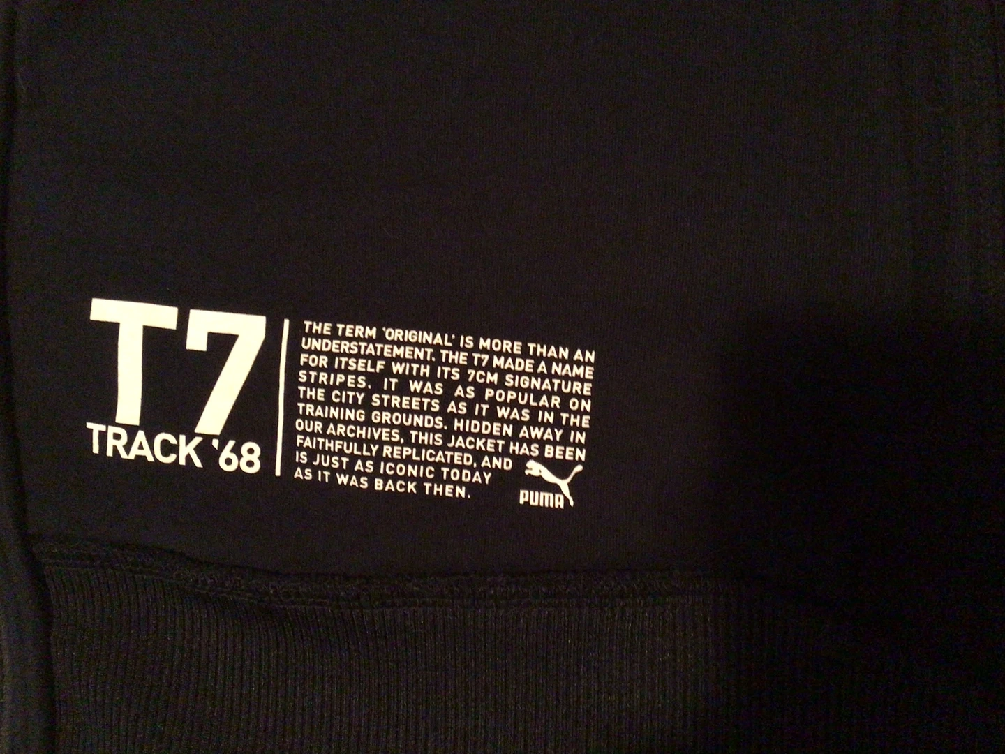 This is a Puma T7 track jacket. It's an original, brand new, never worn jacket of an iconic design. It's black with white stripes. Fully zipped including pockets. High quality comfortable fabric. Size L.