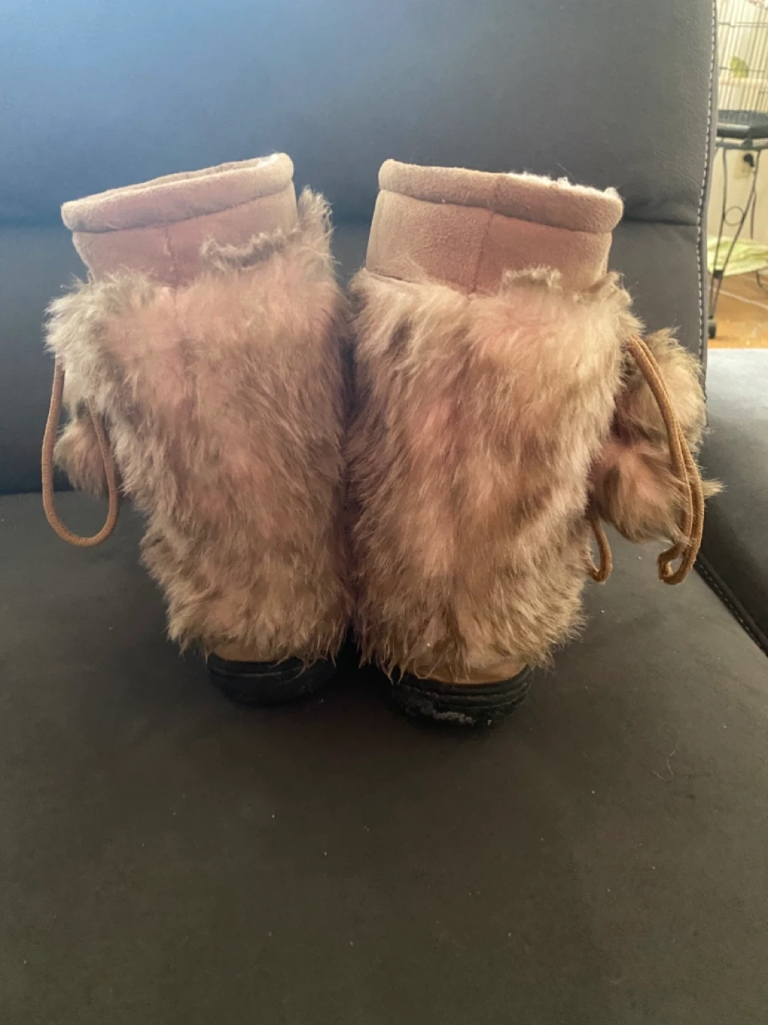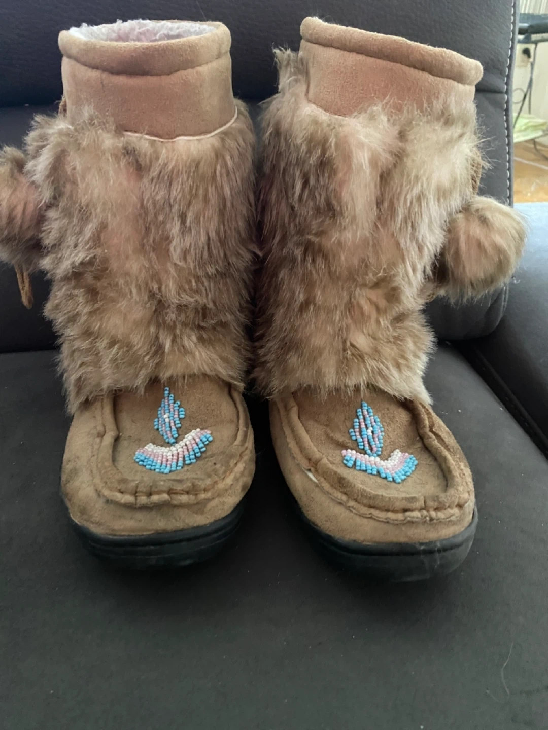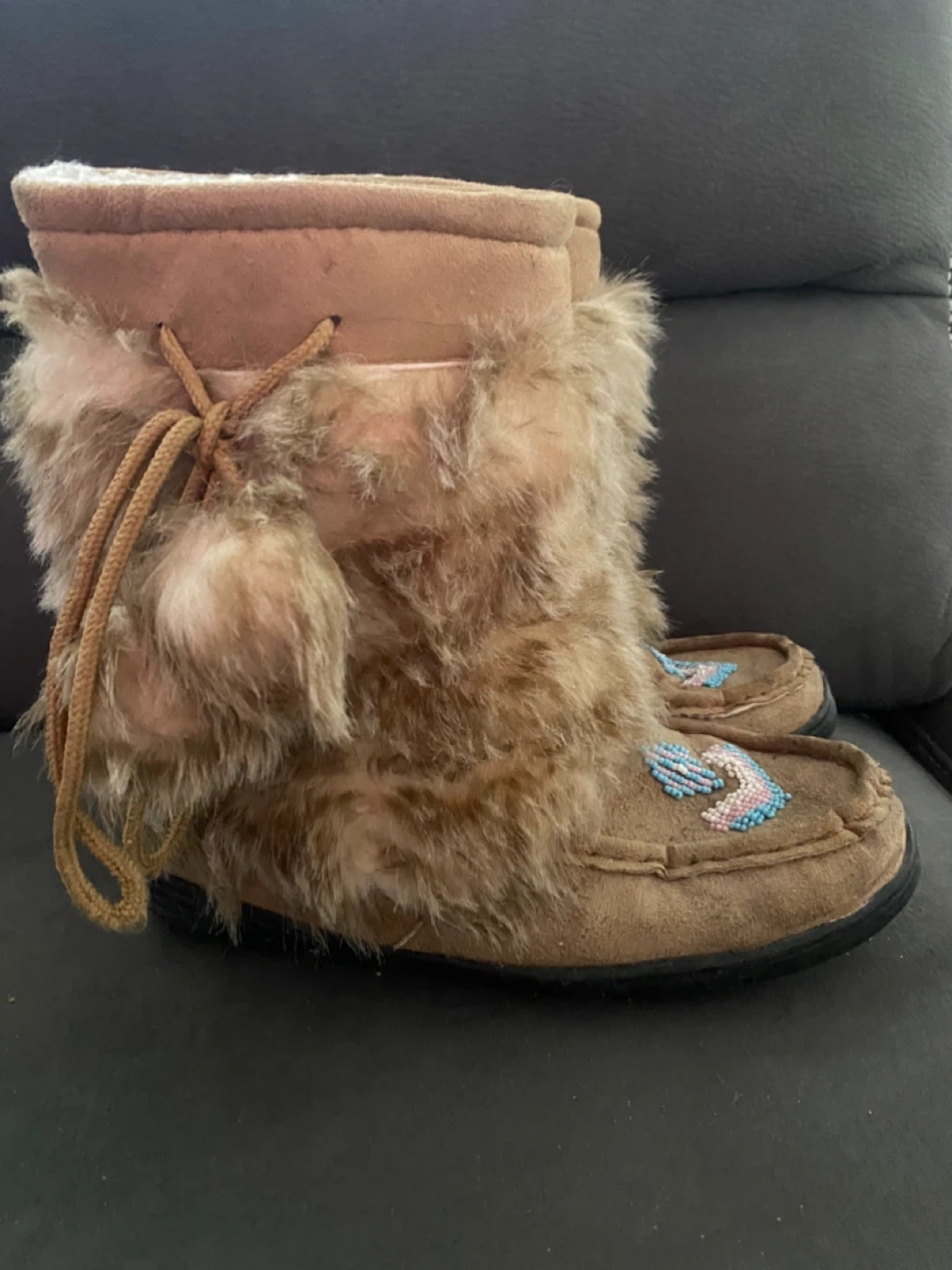 Cozy moccasin boots with fluffy fur trim and decorative beading. These boots feature a soft lining for extra warmth. They have a durable rubber sole for good grip. Perfect for keeping your feet toasty on cool days!