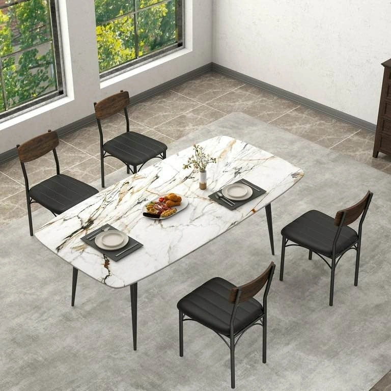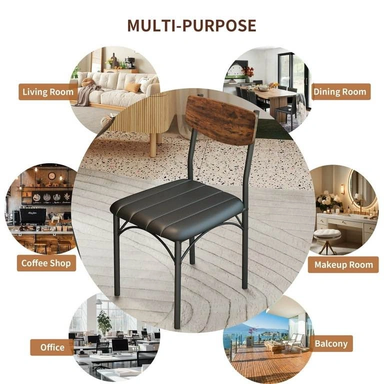 Brand new set of 4 dining chairs featuring PU leather seats with a rustic brown and black design. Durable iron legs provide strong support, and the armless design fits easily around most dining tables. Perfect for dining rooms, kitchens, or modern spaces. Pickup in Hamilton.