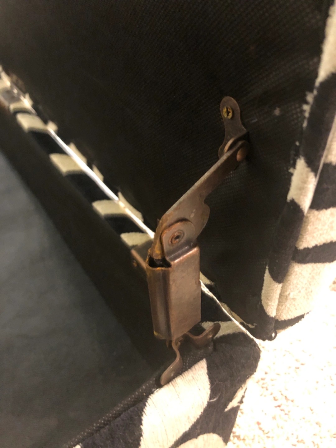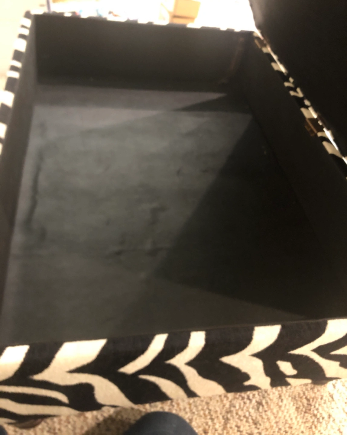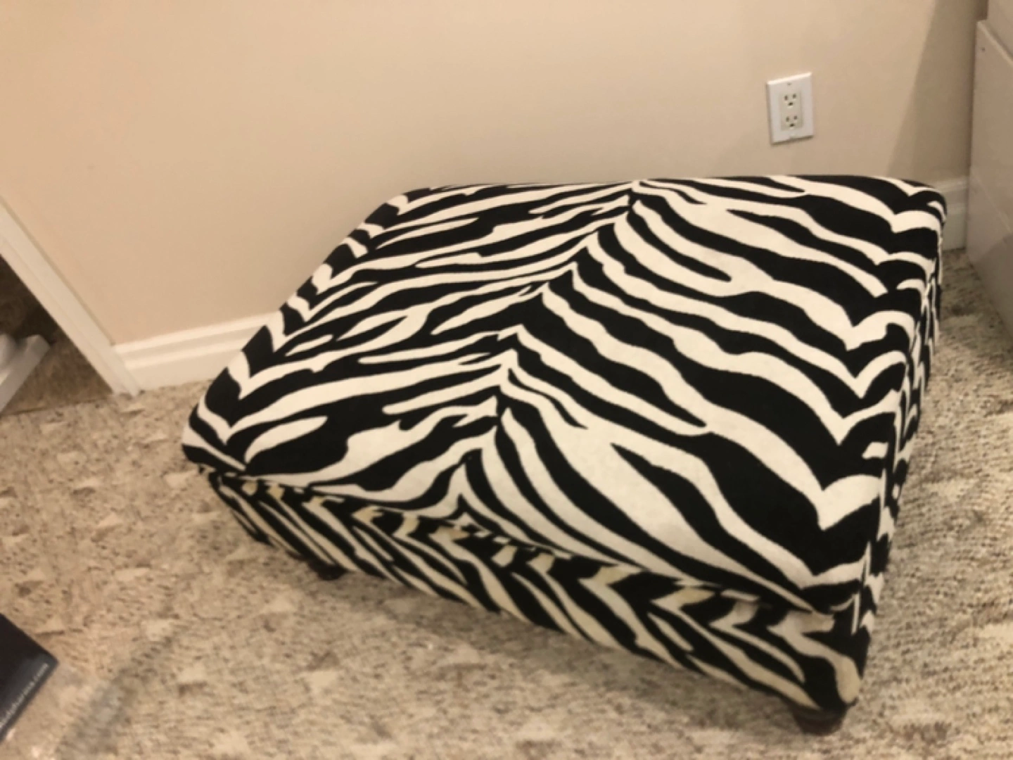 Zebra print storage piece. Can sit on it as well. Good to add to a living room. The hinges don’t hold it up but can be placed in a way to do so. Doesn’t affect function of unit.