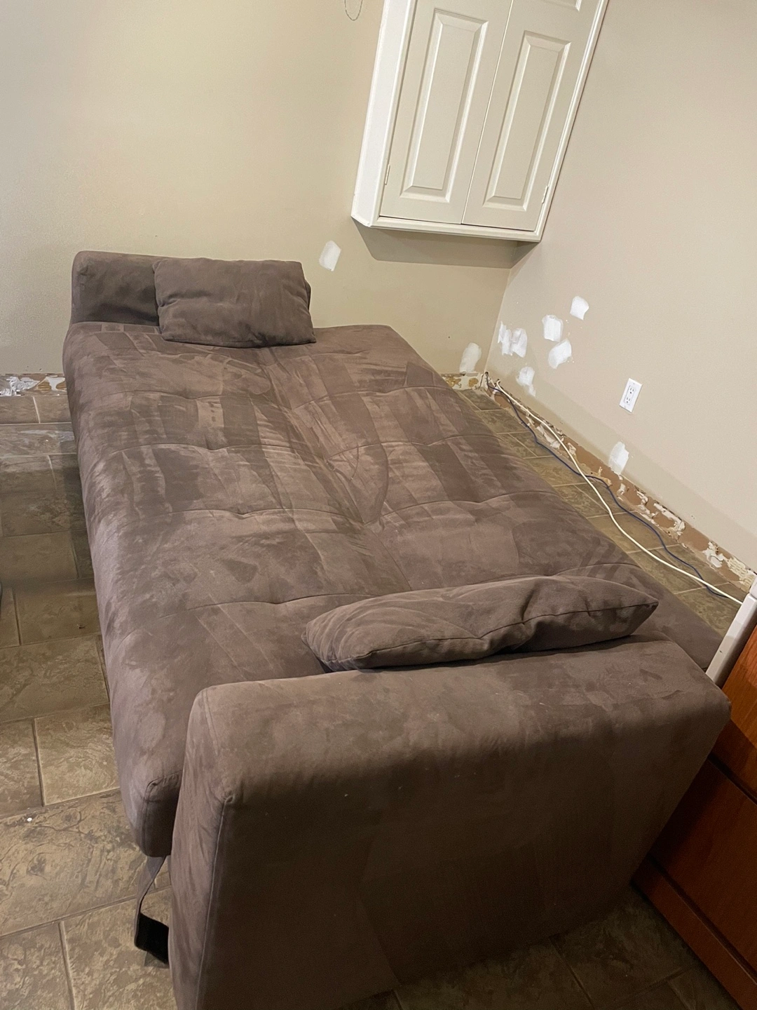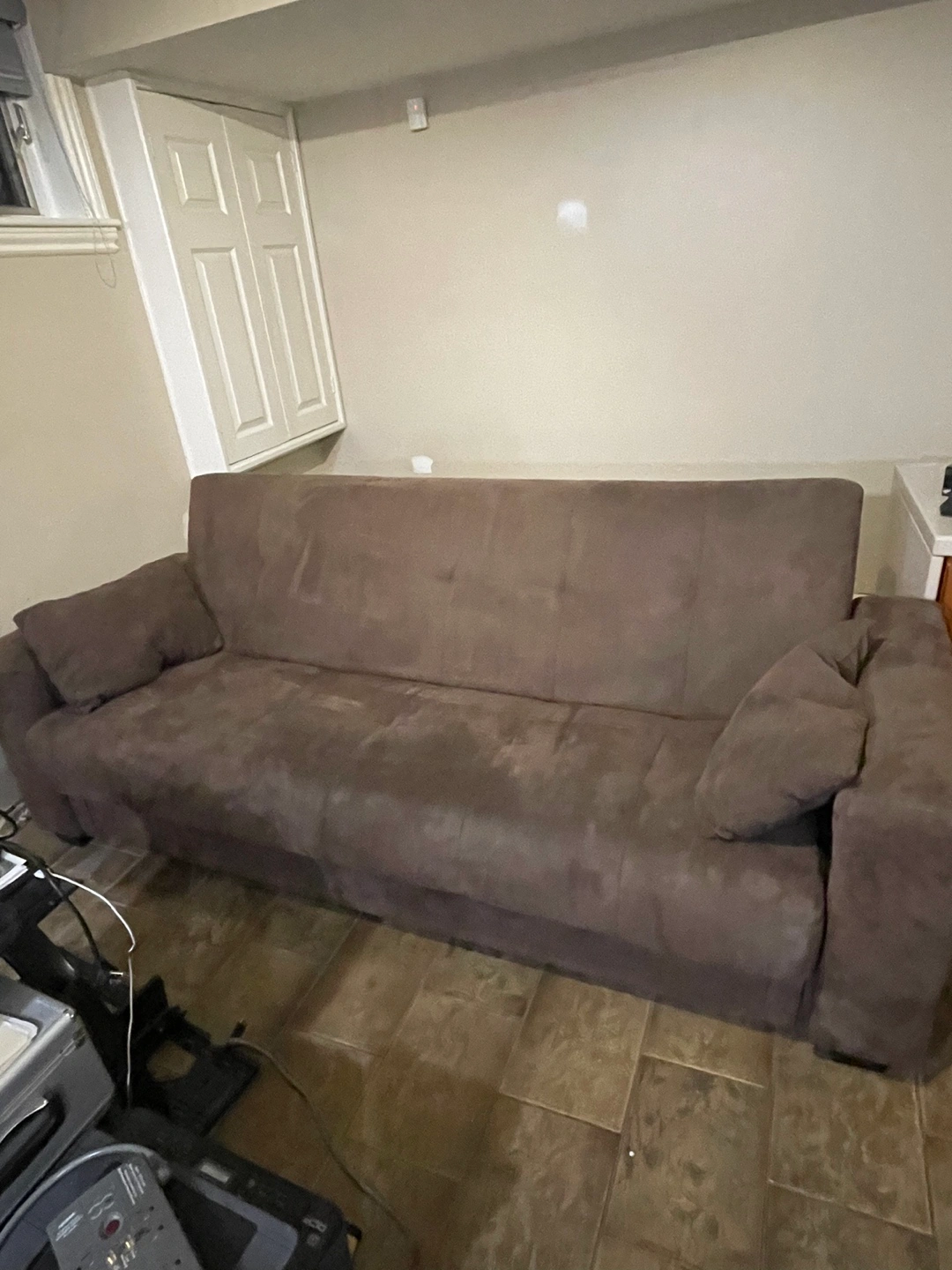 Brown faux suede futon couch with storage in good condition. Can be dissemble.
