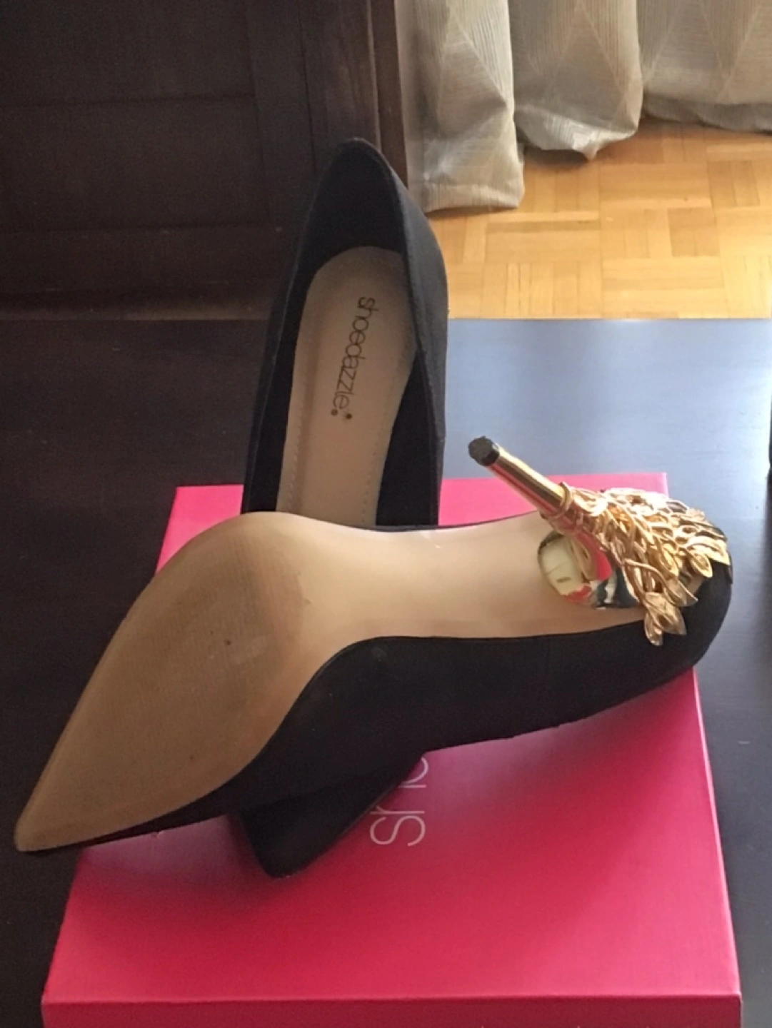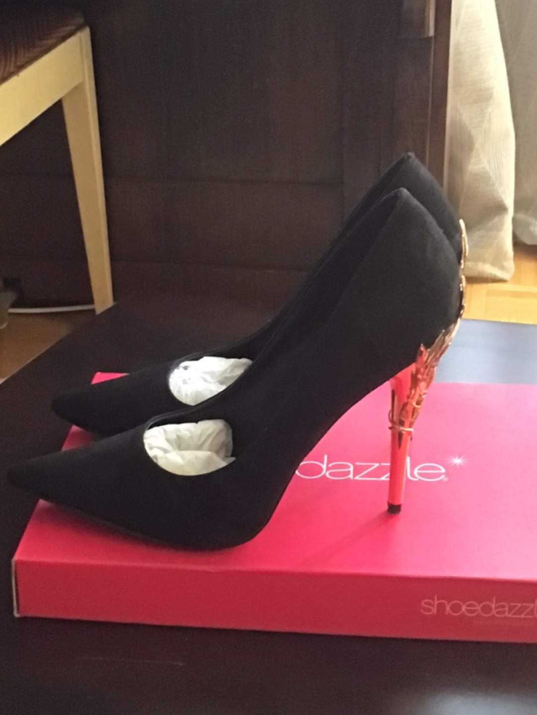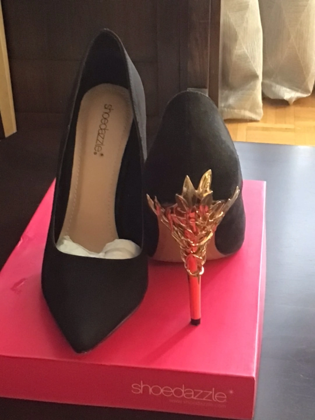 Faux suede black shoes for sale. Size 10. Gold heel is about 4”. Tried to wear once, but too tight. Shoe dazzle brand. Price is negotiable