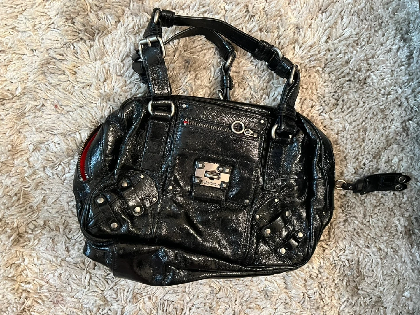 Shiny black patent leather satchel handbag with silver hardware. Features a red interior lining and multiple exterior pockets. This bag is a stylish accessory for everyday use!