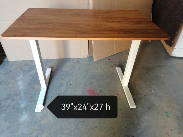 This is an adjustable desk with a wood-look top measuring 39"x24" and has a height of 27". This desk is used, but it remains in good condition and is ready to enhance your workspace. Natural wood tops, bottom metal legs white. It is an electric desk that goes up and down, but missing controller. If take off the motor, it can be used manually. Original price over $600. If you're seeing this ad, rest assured, the desk is still up for grabs! Pick up near Chinook Mall.