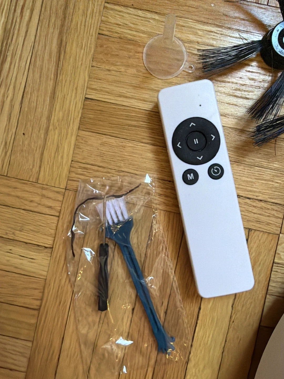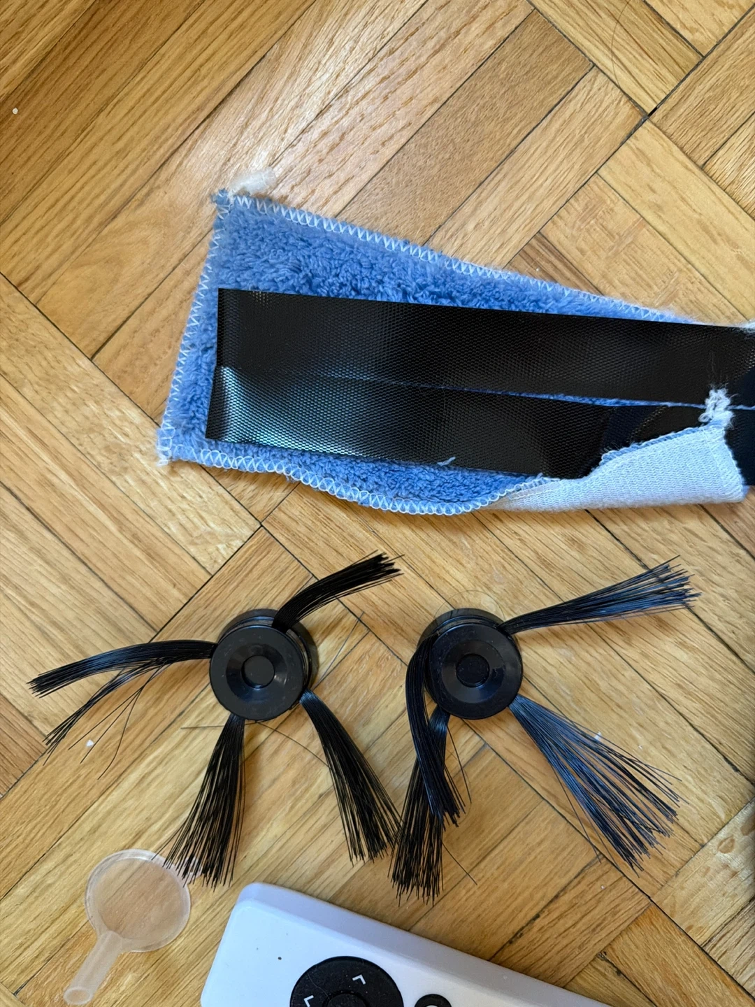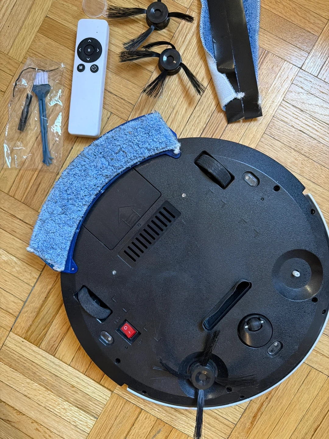 White robot vacuum cleaner. Includes a remote control, two side brushes, a cleaning brush, and a mopping pad. It's ready for cleaning! Great for hardwood floors. We used this once (it was a gift) but prefer our handheld vacuum. We have not used this in over a year, so it likely needs new batteries and someone who knows how to use this, as we are not very familiar with this type of technology.