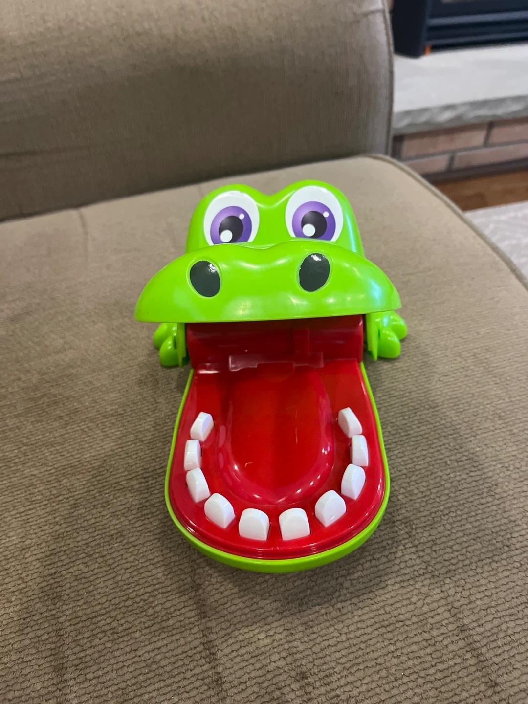 It's a fun crocodile gag toy with a spring-loaded jaw and big, colourful eyes. Made of durable plastic, it's ready for playtime! This toy is great for quick laughs and playful surprises.