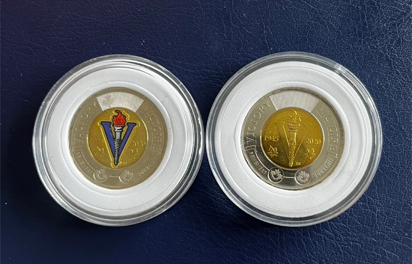 15 dollars each both 25 dollars Two Canadian $2 coins commemorating Victory in 2020. Each coin features the effigy of Queen Elizabeth II on the reverse and a V for Victory symbol with a torch on the obverse. These are collector coins in protective casings.