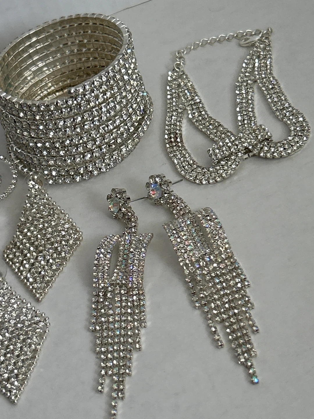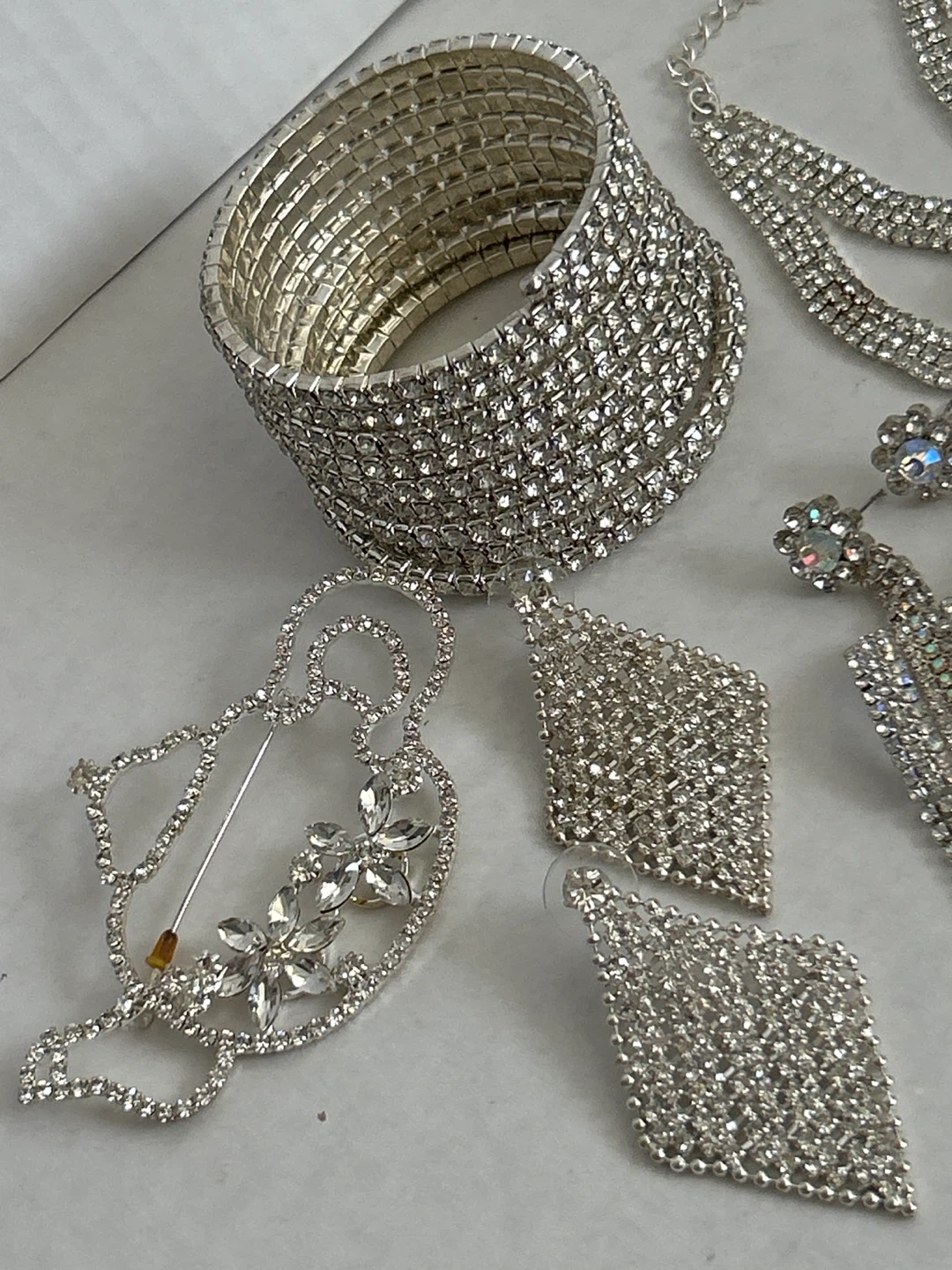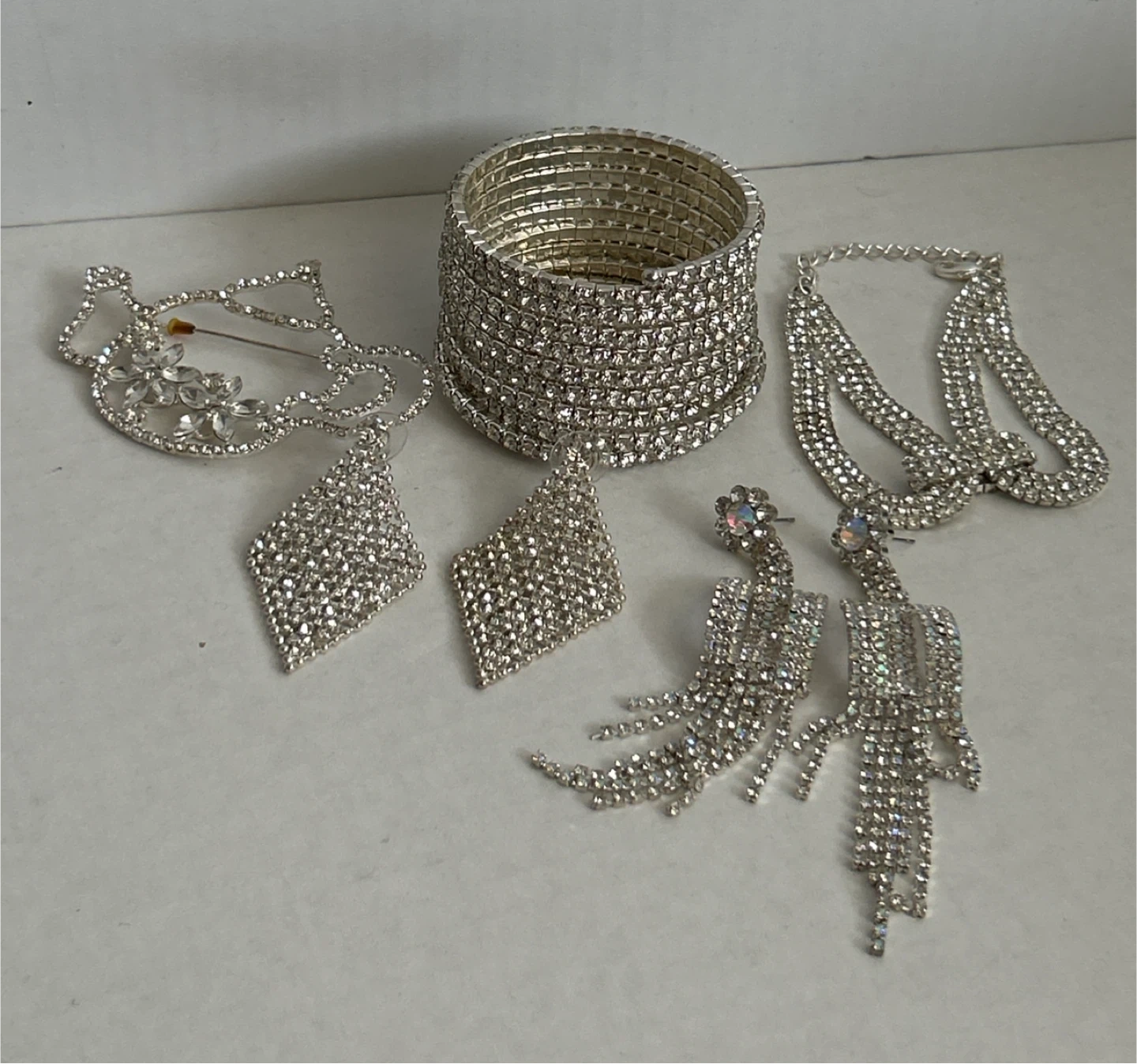 Selling a collection of good quality sparkly rhinestone jewelry set featuring 2 pieces of bracelets, one beautiful knot style and a wide cuff bracelet, 2 pairs of dangling earrings, and a brooch. The 5 pieces are adorned with clear rhinestones for a dazzling effect. Perfect for adding glamour to special occasions!