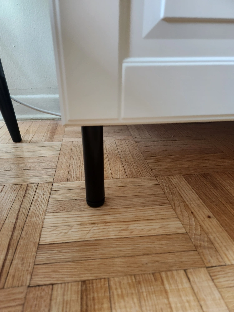 comes with six sleek black legs and two modern doors and a shelving unit.