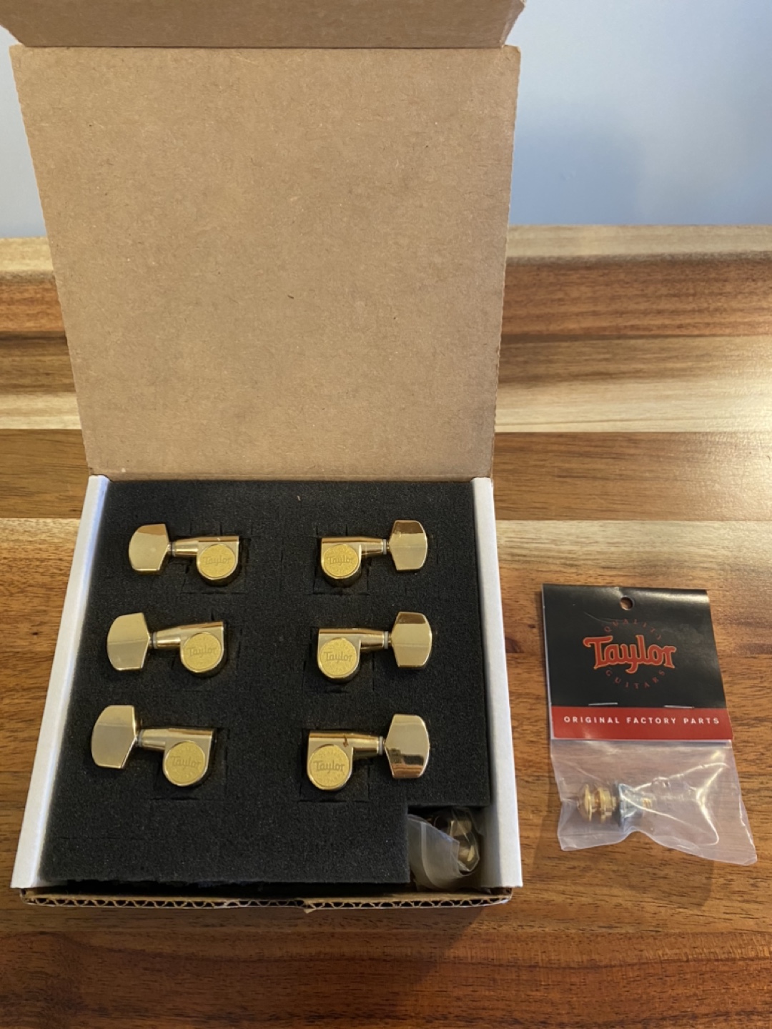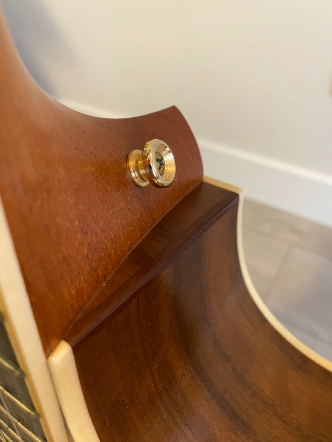 - Replaced with gold tuners, gold strap button and ebony bridge pins (original silver tuners come with it in the box).