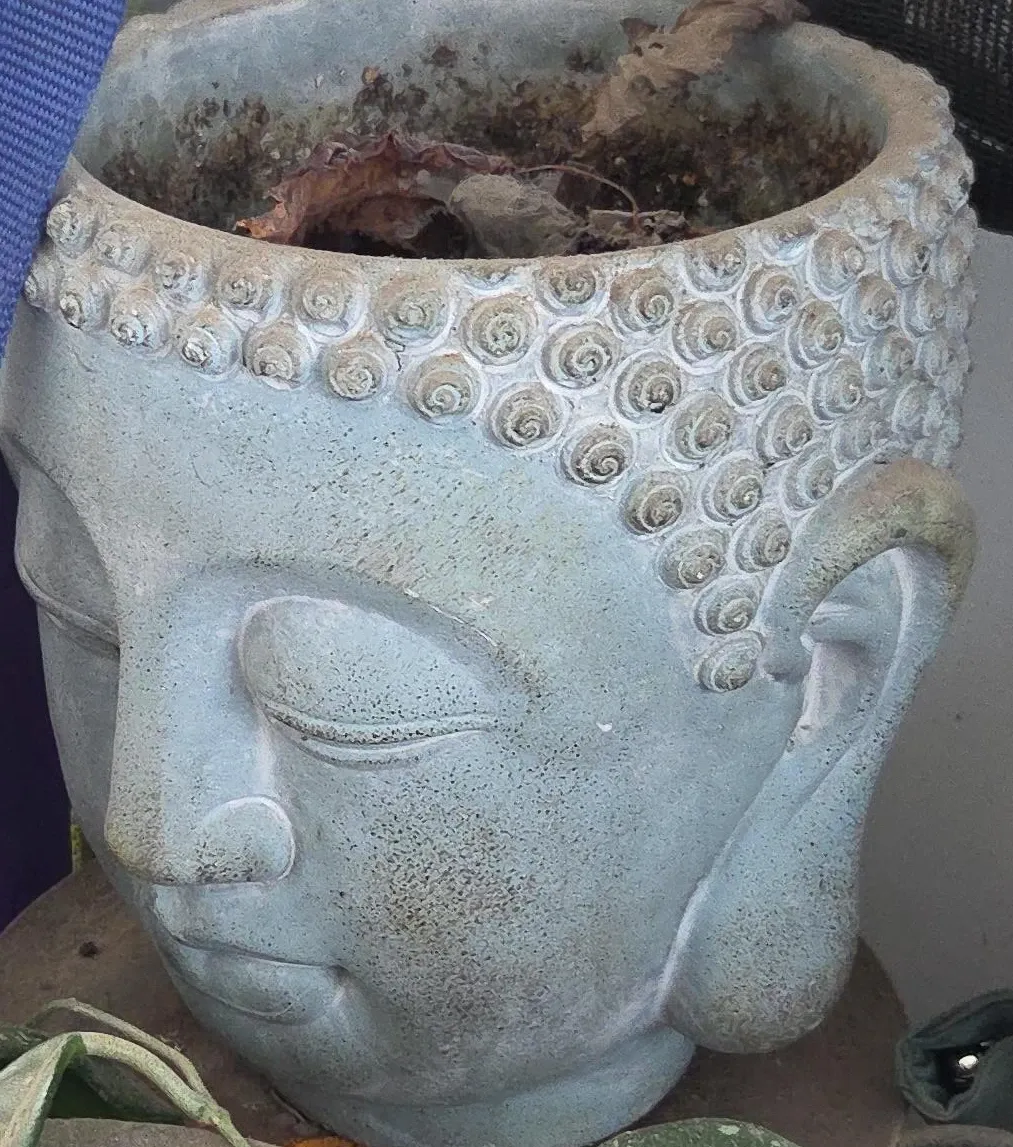 Decorative planter designed to look like a Buddha head. It's made of a durable material with a light blue-grey finish. This unique pot adds a serene touch to any space.