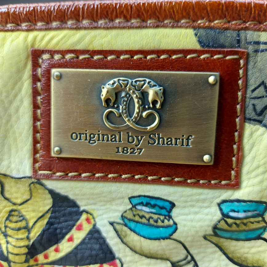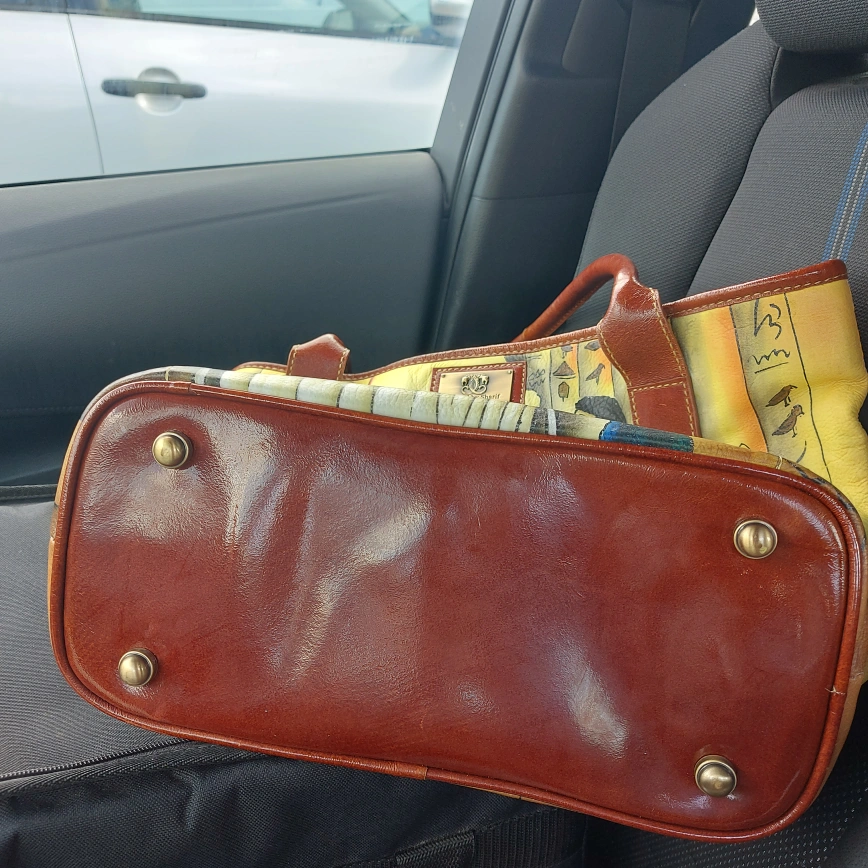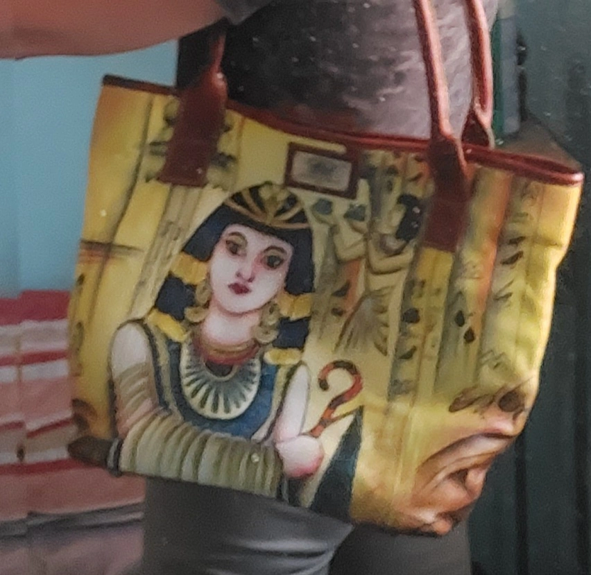 100 % genuine leather , painted over by hand with Egyptian scenery , very beautiful and unique, open to negotiations :) made by Sherriff designer from New York . it's just a bit to big for me , but it's a beautiful bag :)