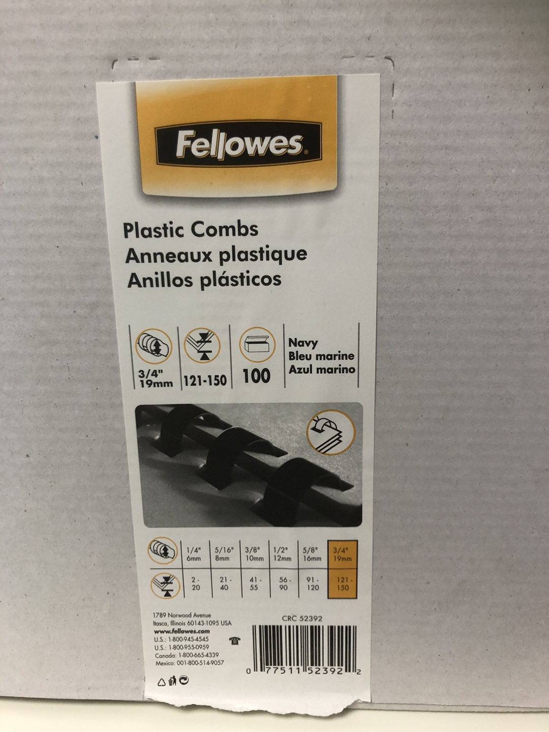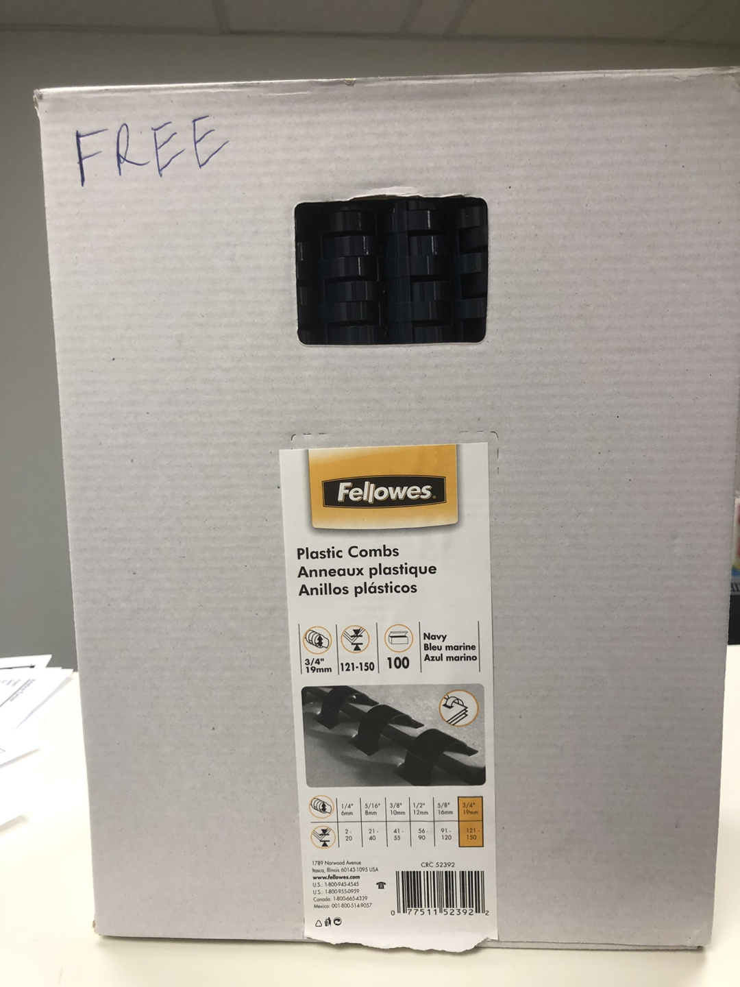 346Box of 100 (or likely 99) navy blue plastic combs for binding documents.
