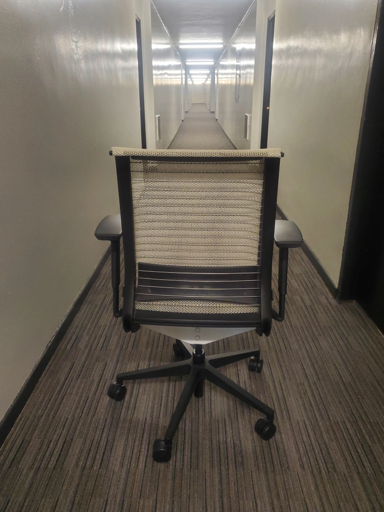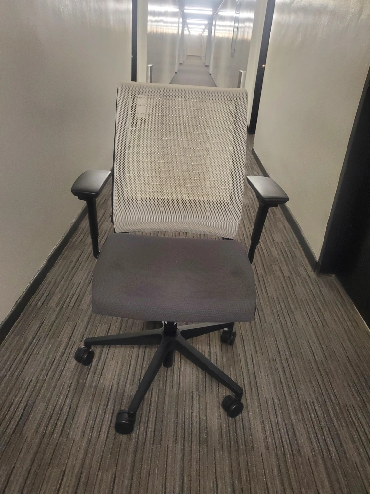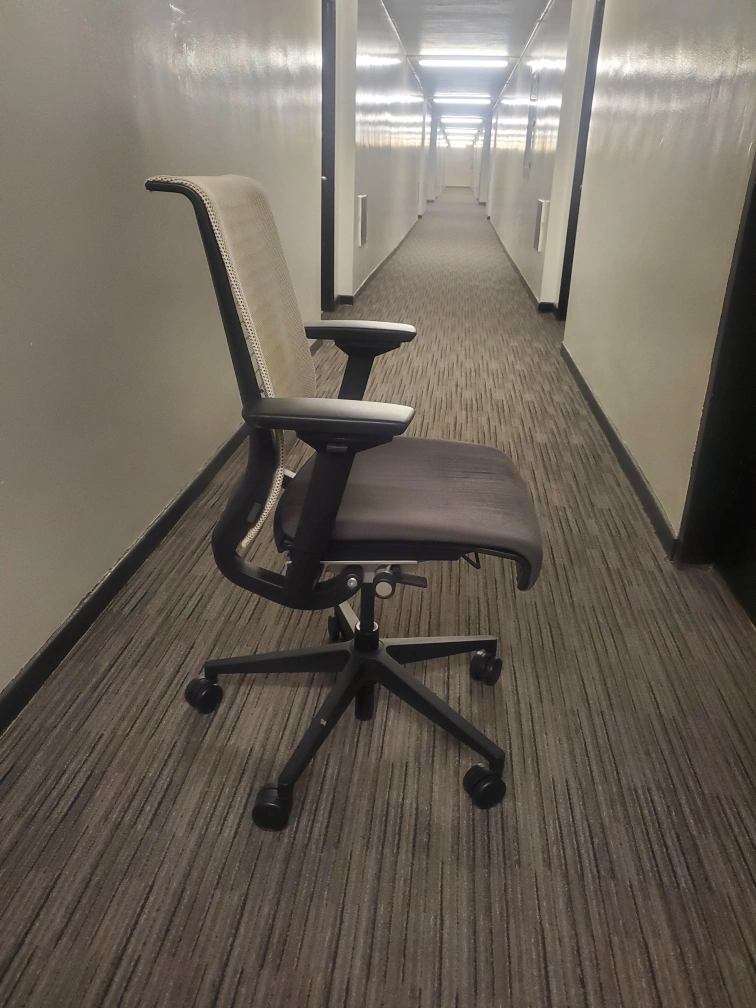 Office chair barely used with adjustable arm rests and leaning back stand.