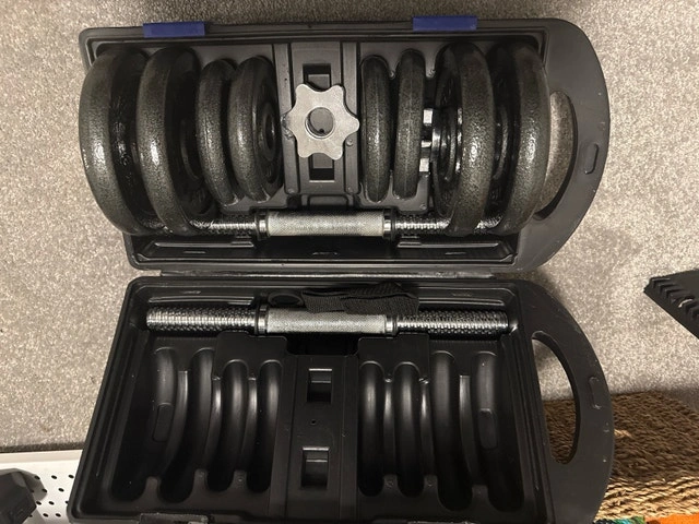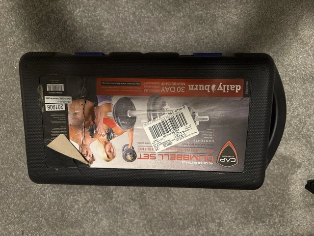 Get ready to pump some iron with this CAP 40 lb adjustable dumbbell set! This set is used, but still has plenty of life left for your workouts. Perfect for building strength and toning muscles in the comfort of your own home. Adjustable weights for customized workouts. Comes with a convenient carrying case. CONTENTS: 4 x 5LB WEIGHTS, 4 x 2.5LB WEIGHTS, 4 x SPIN LOCK COLLARS, 2 x 14-INCH DUMBBELL, 1 x STORAGE CASE. Cash accepted.