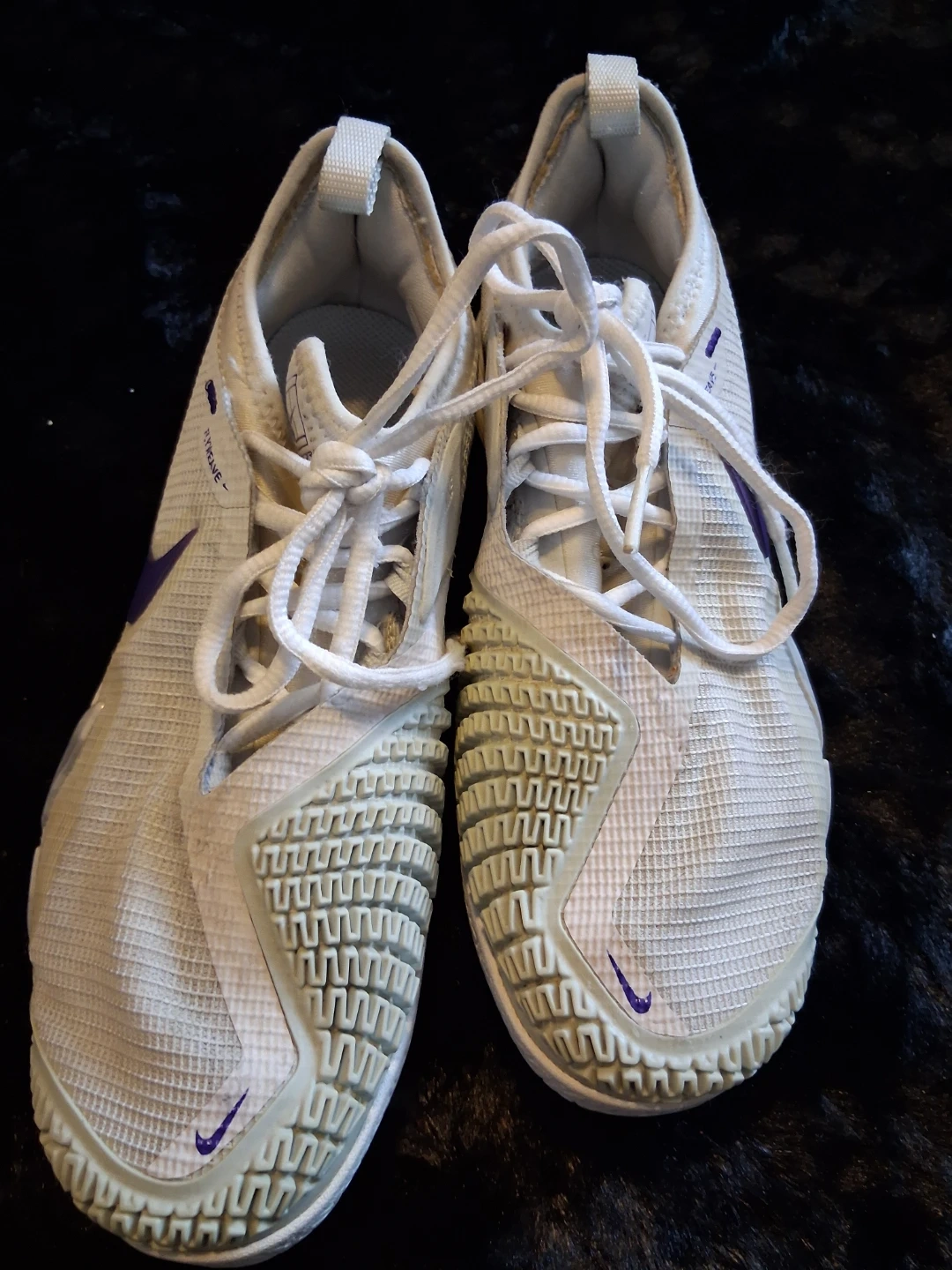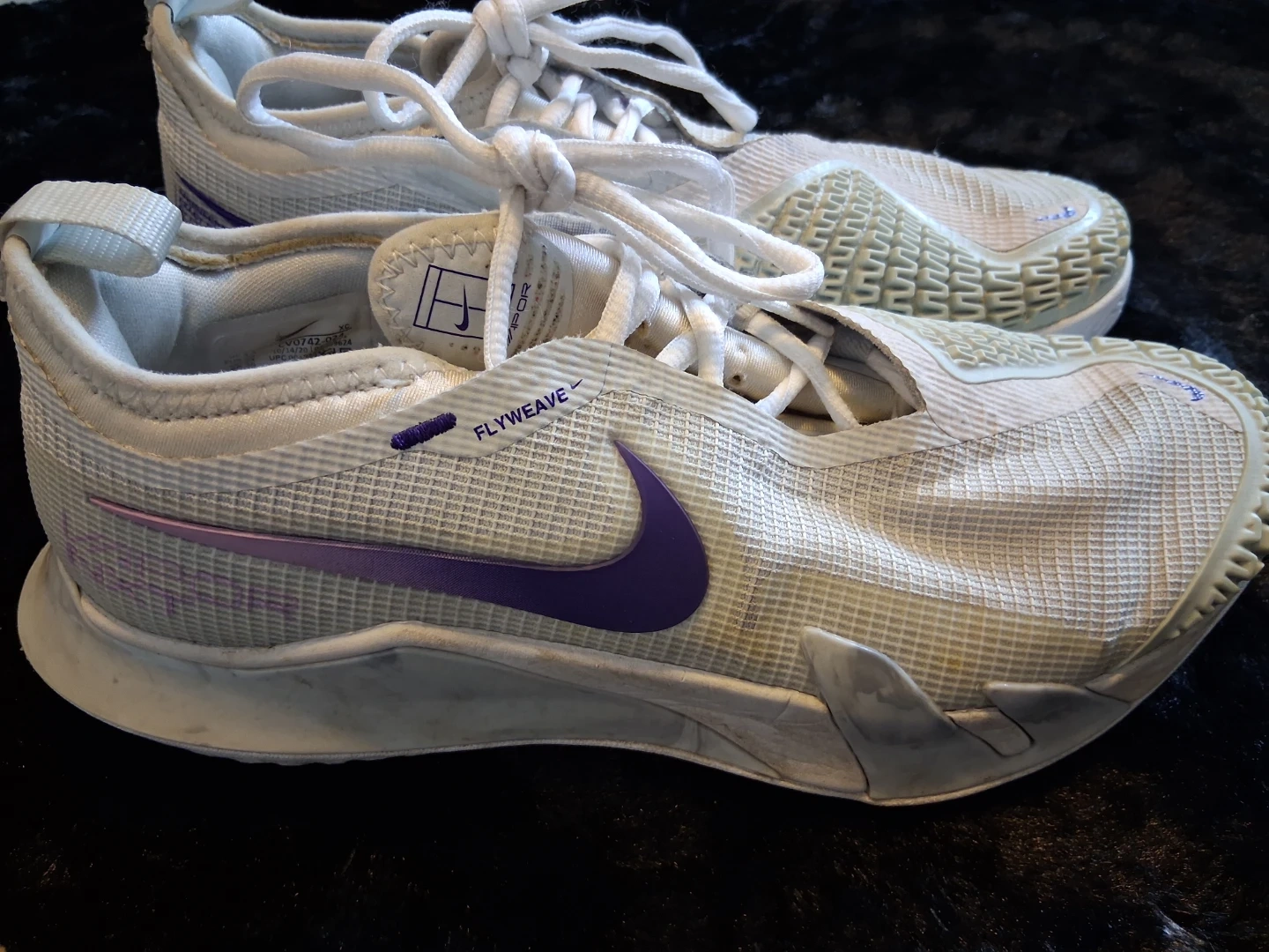 These are Nike Vapor tennis shoes in white and purple. They feature Flyweave technology. Designed for tennis performance!