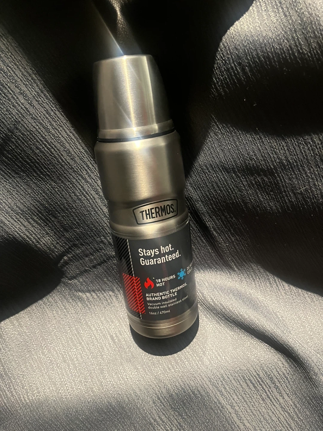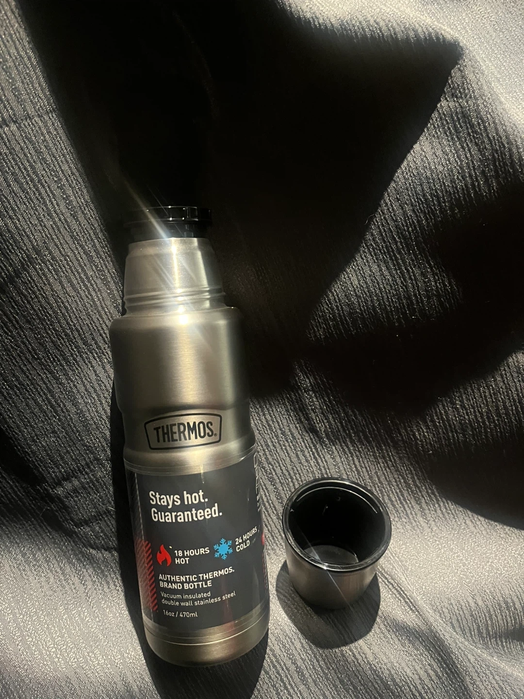 This is an authentic Thermos brand bottle, built with a double wall stainless steel design. It's guaranteed to keep drinks hot for 18 hours and cold for 24 hours. This bottle is perfect for everyday use or for outdoor adventures.