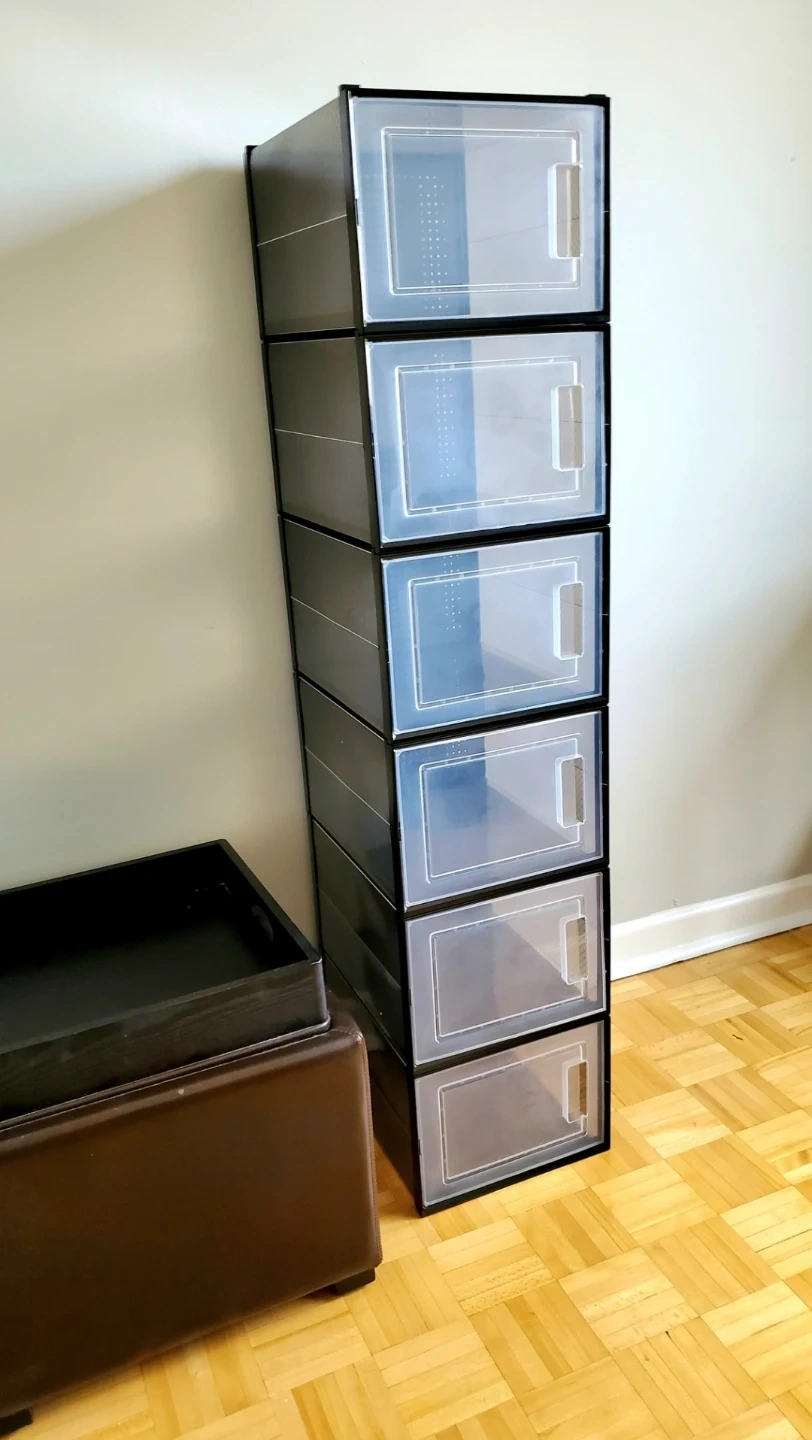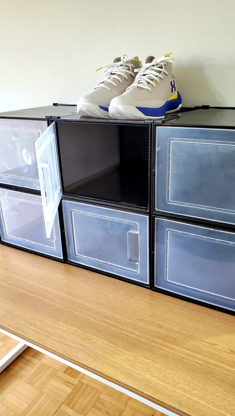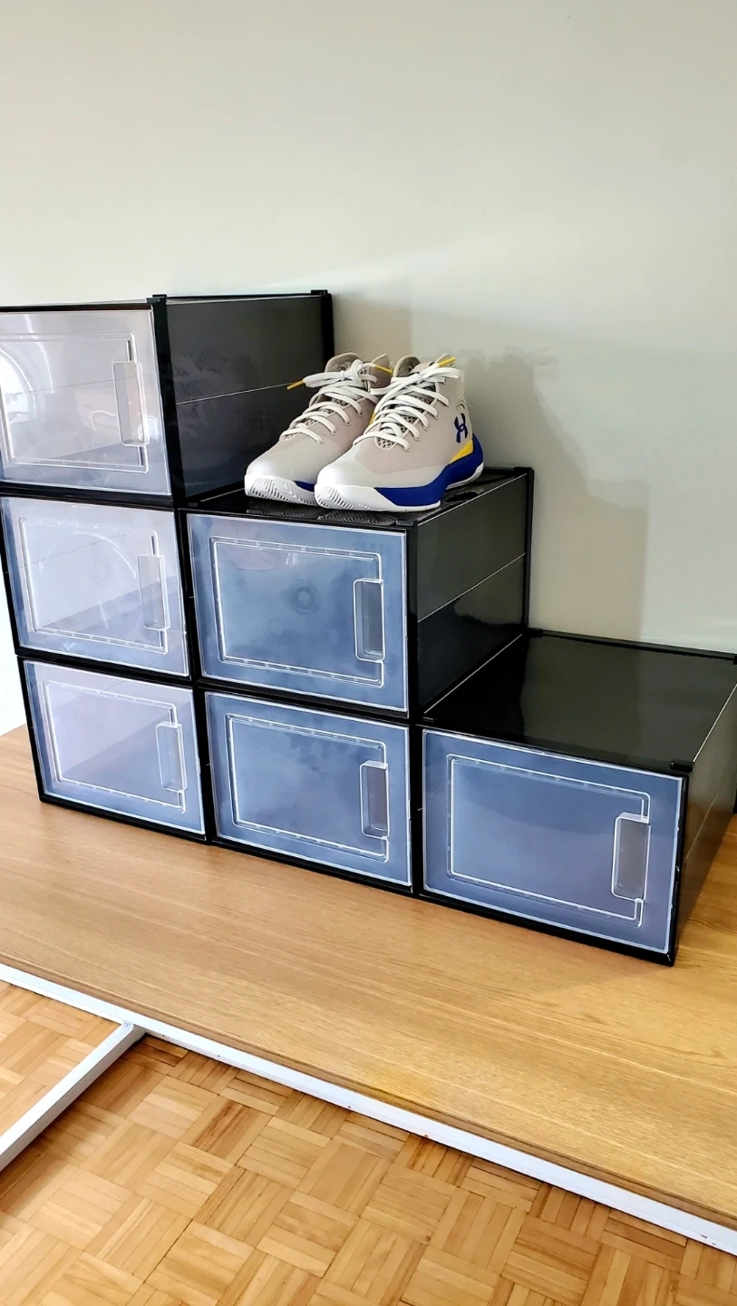 This 12-pack of shoe storage boxes are brand new still in box, and can be used to organize shoes clothes, cosmetics, etc. The black translucent design allows you to see what's inside. The boxes can hold weight, and they are stackable to each other. Each one has a large size (my sample shoe is 9.5 mens, but women's shoes will even fit more) It can hold up to size 12/13, and you can see dimensions in one of my photos.