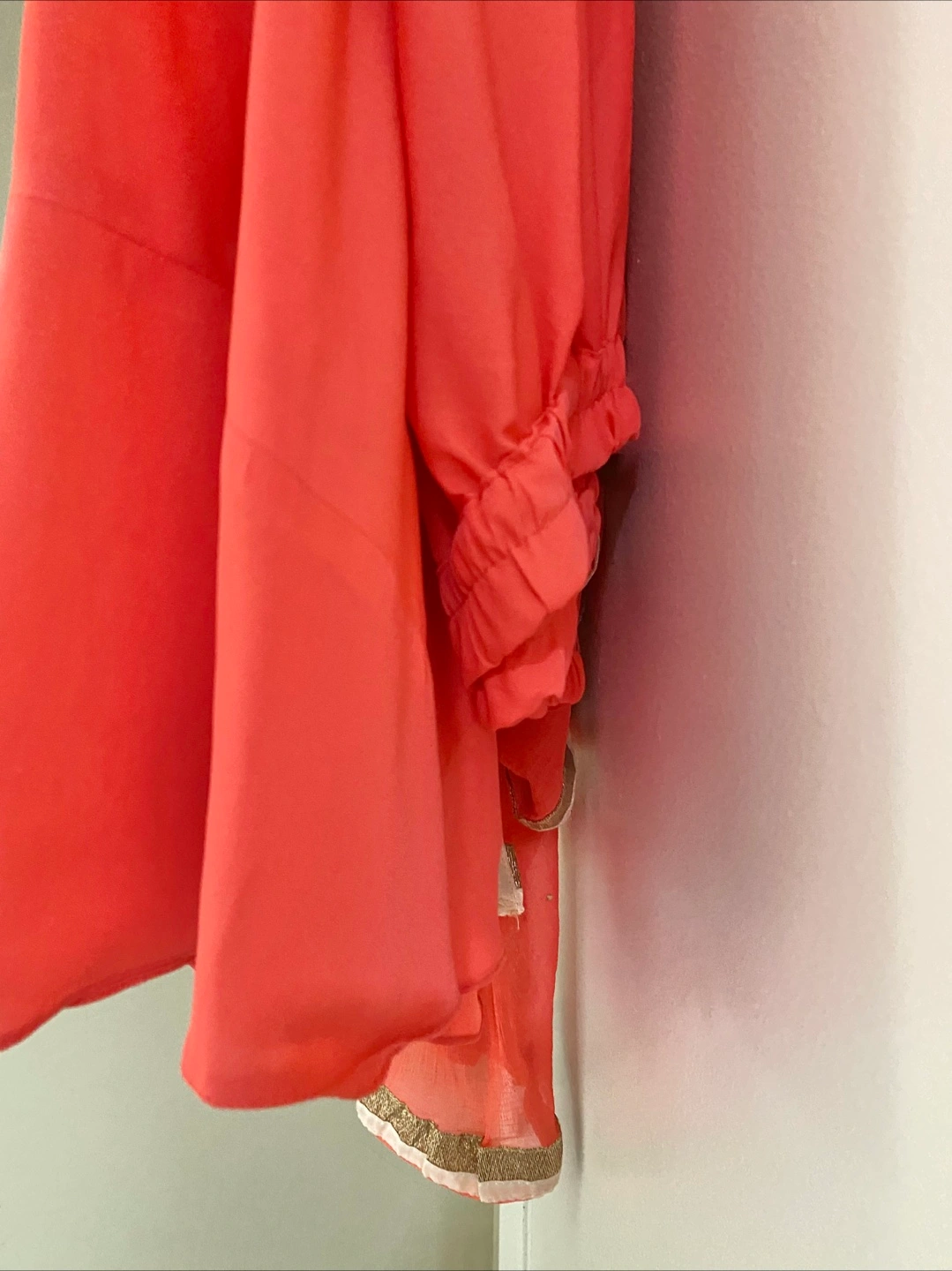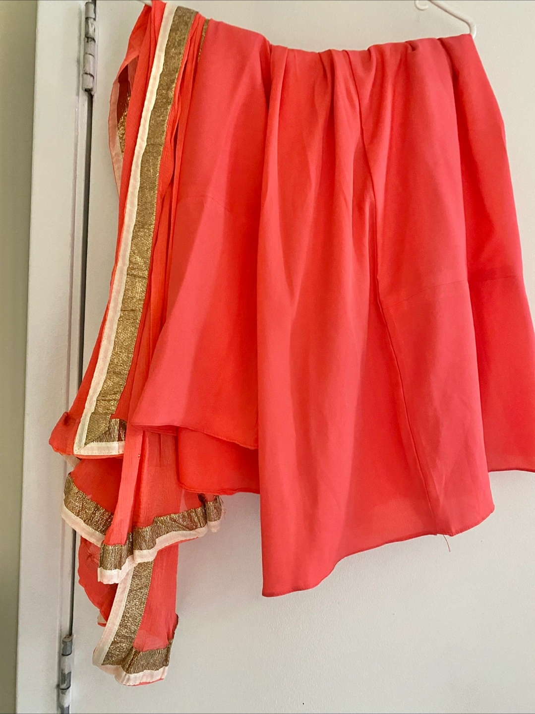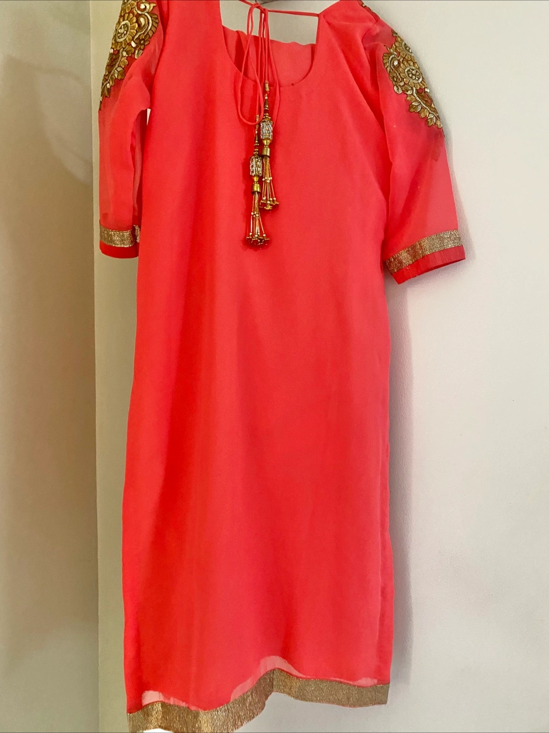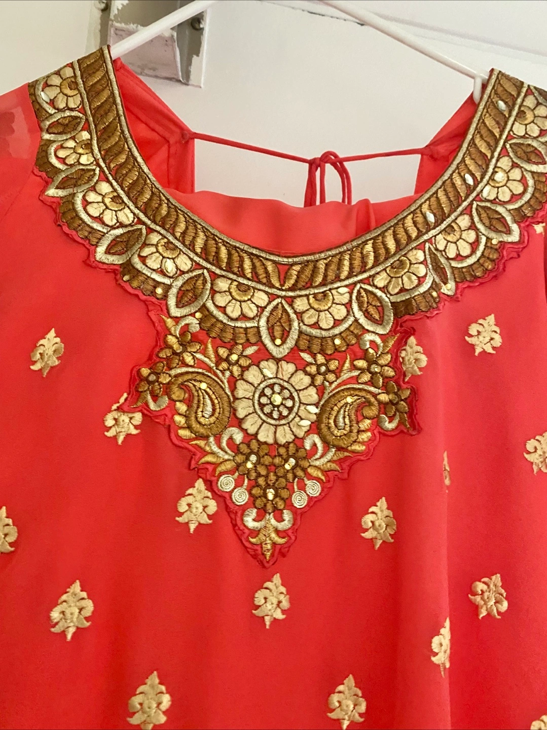 Beautiful coral dress with intricate gold embroidery! It's in great condition and ready for a new home. Perfect for a special occasion or just feeling fancy.