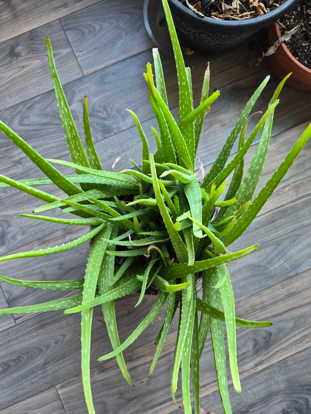 Healthy aloe vera plant in a black pot. It's easy to care for and a popular houseplant. This plant's gel is known for its soothing properties.