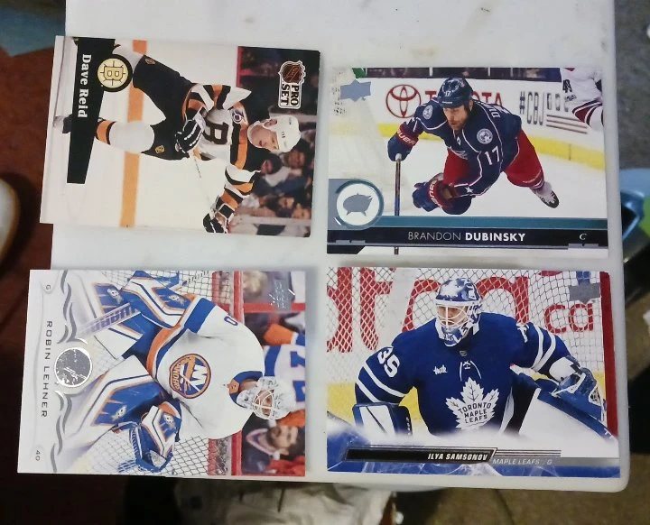 This collection features four NHL hockey cards: Dave Reid, Brandon Dubinsky, Robin Lehner, and Ilya Samsonov. Each card includes player stats and team information on the back. A great addition for any hockey fan!