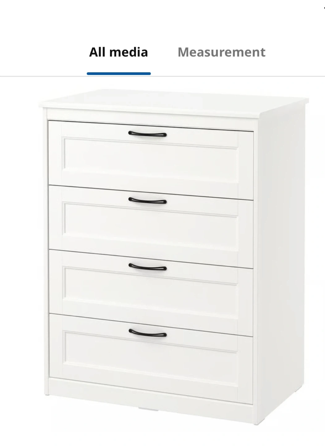 White 5-drawer dresser from IKEA's HEMNES series. It's 82cm wide, 50cm deep, and 103cm high. Drawer interiors are 71cm wide and 14cm deep. Great for storing clothes or linens!