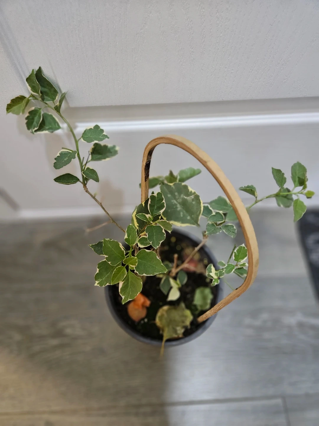 A lovely variegated Bougainvillea plant in a dark pot. It's got a unique wooden handle attached to the rim. Perfect for adding some greenery to your space! Bring some life into any room with this vibrant plant.