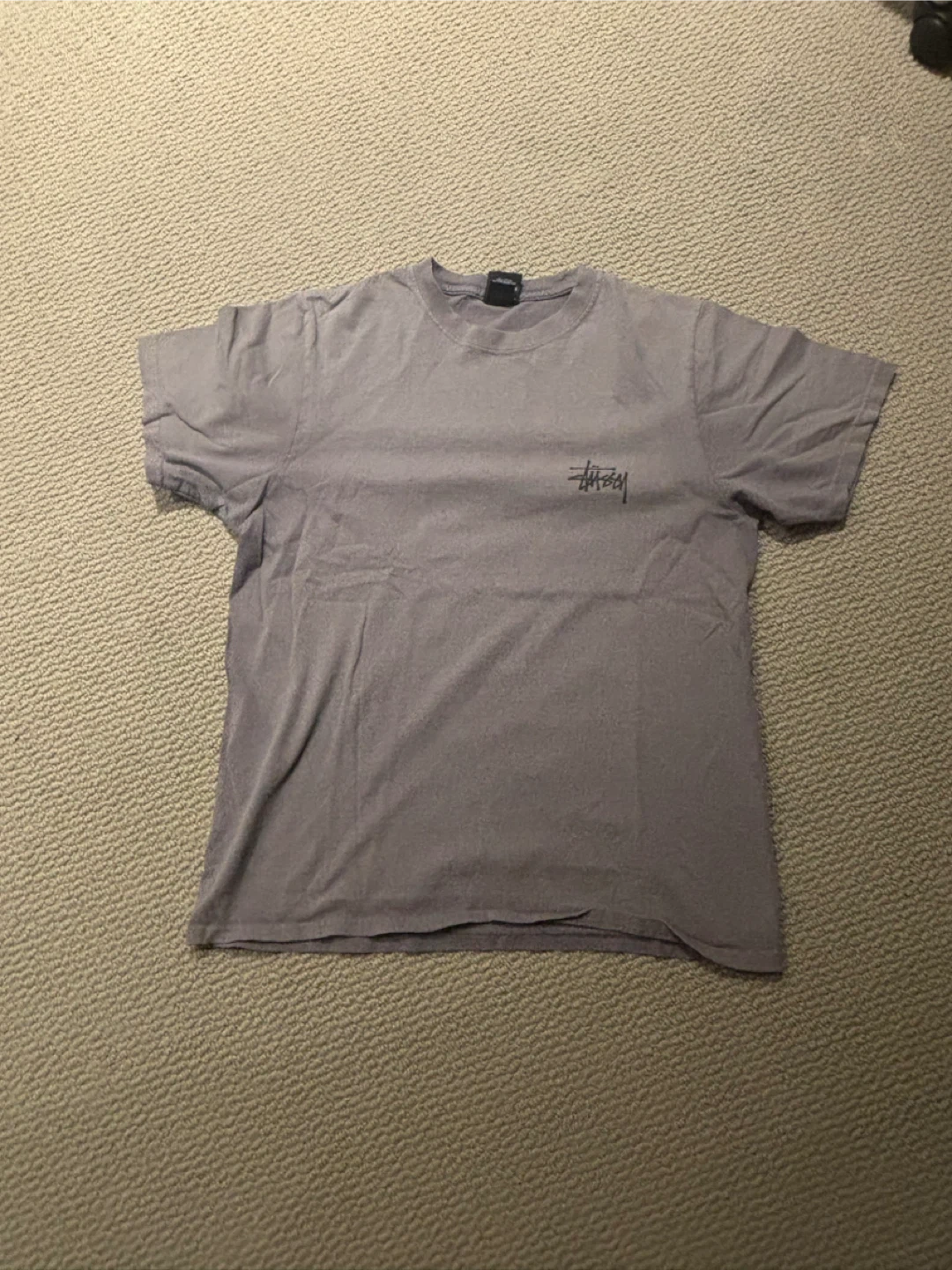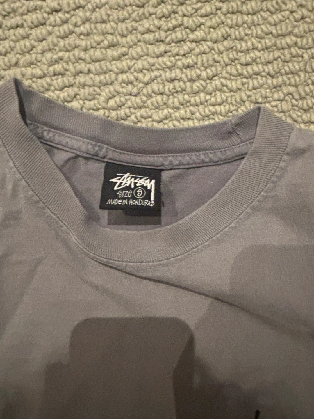 This is a Stüssy graphic t-shirt. It's grey and made of cotton. Made in Honduras. This shirt features St üssy branding and graphic text on the back. It's a size small.