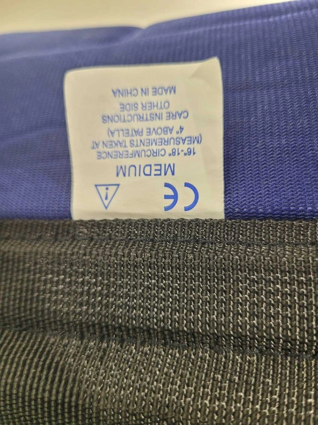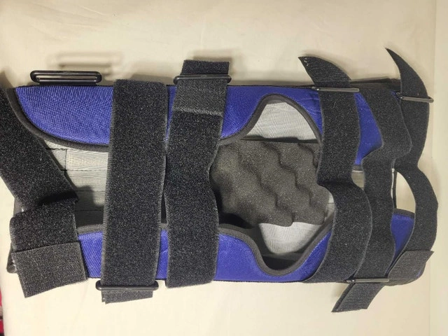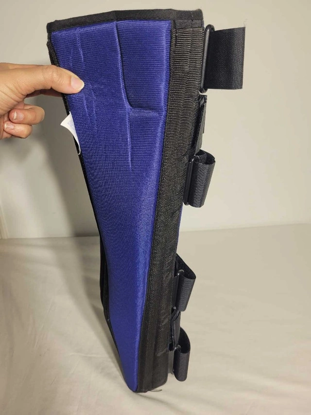 Like new. Adjustable and breathable knee splint or leg support brace with light steel plate support. Medium size, 16"-18" circumference at 4" above patella.