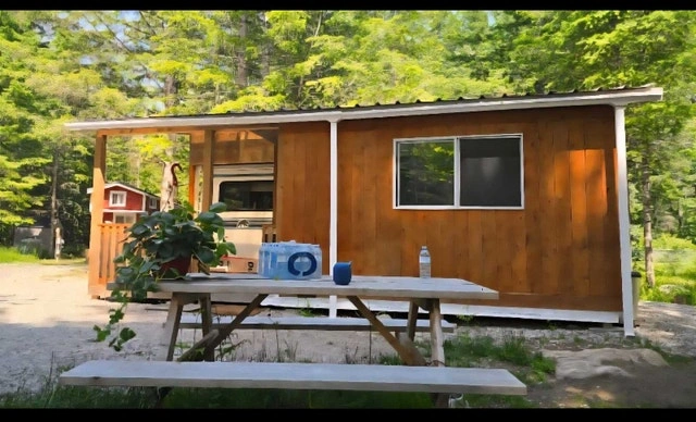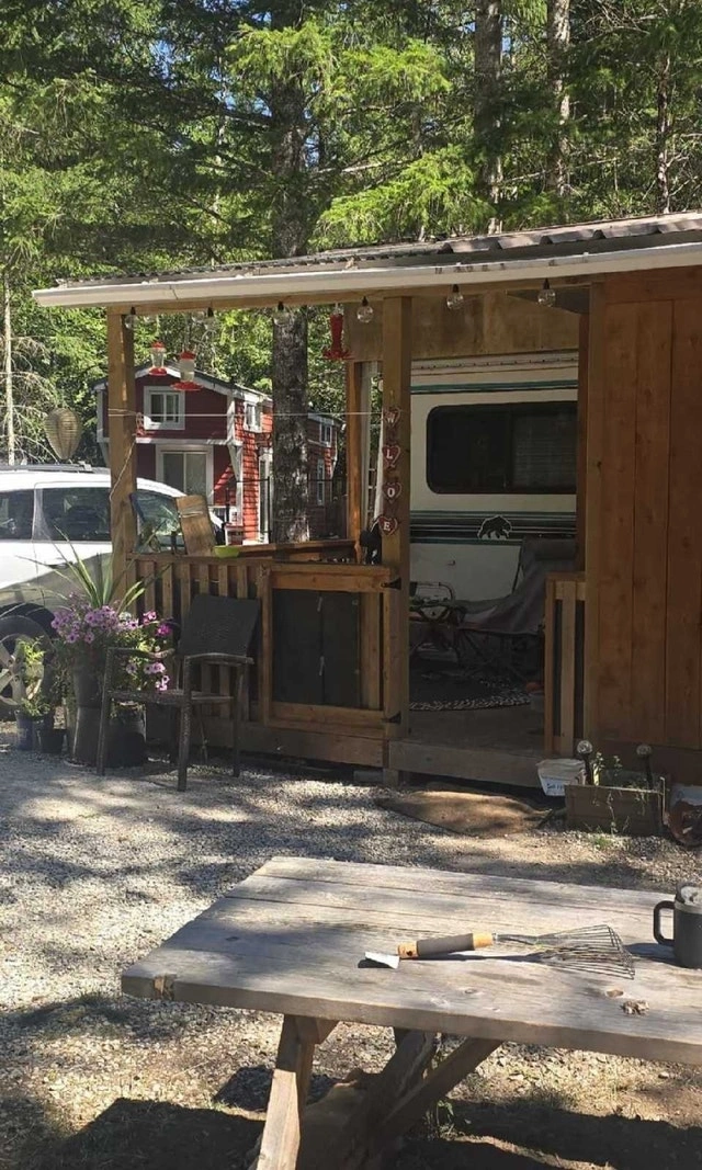 Cozy wooden cabin with picnic table and outdoor space with a fire pit. The cabin is well-maintained and has peaceful surroundings. Includes a 1997 Kodiac 5th wheel trailer with an addition room and porch. Located near Hope BC in a very quiet RV park. Monthly lot fee is $680, electricity is on a meter. Features a new queen-size bed, bathroom, kitchen, and living room. Ample space for you and your furry babies. Great for someone who enjoys a spiritualist lifestyle, yoga, quiet, and privacy. Camera at the front entrance and gates close at dark. Only message if you are serious.