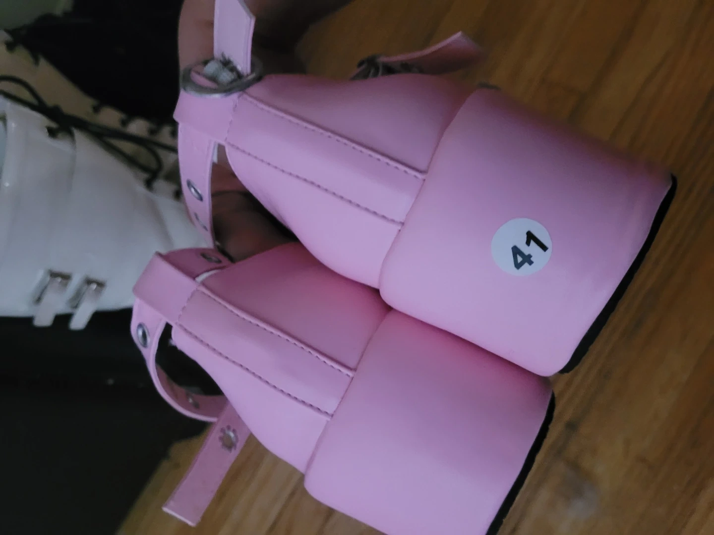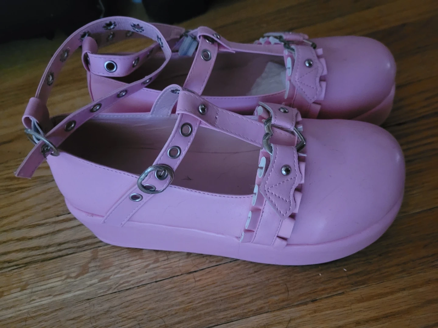 These pink Mary Jane platform shoes feature a cute ruffled design with buckle straps. The size is 41, indicated on the heel. They're made of faux leather and have a comfortable platform sole.