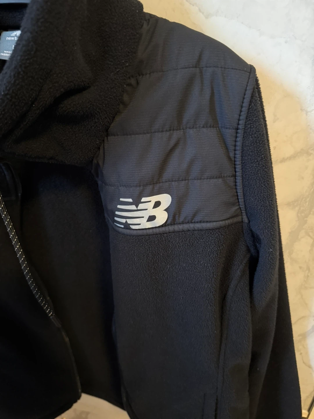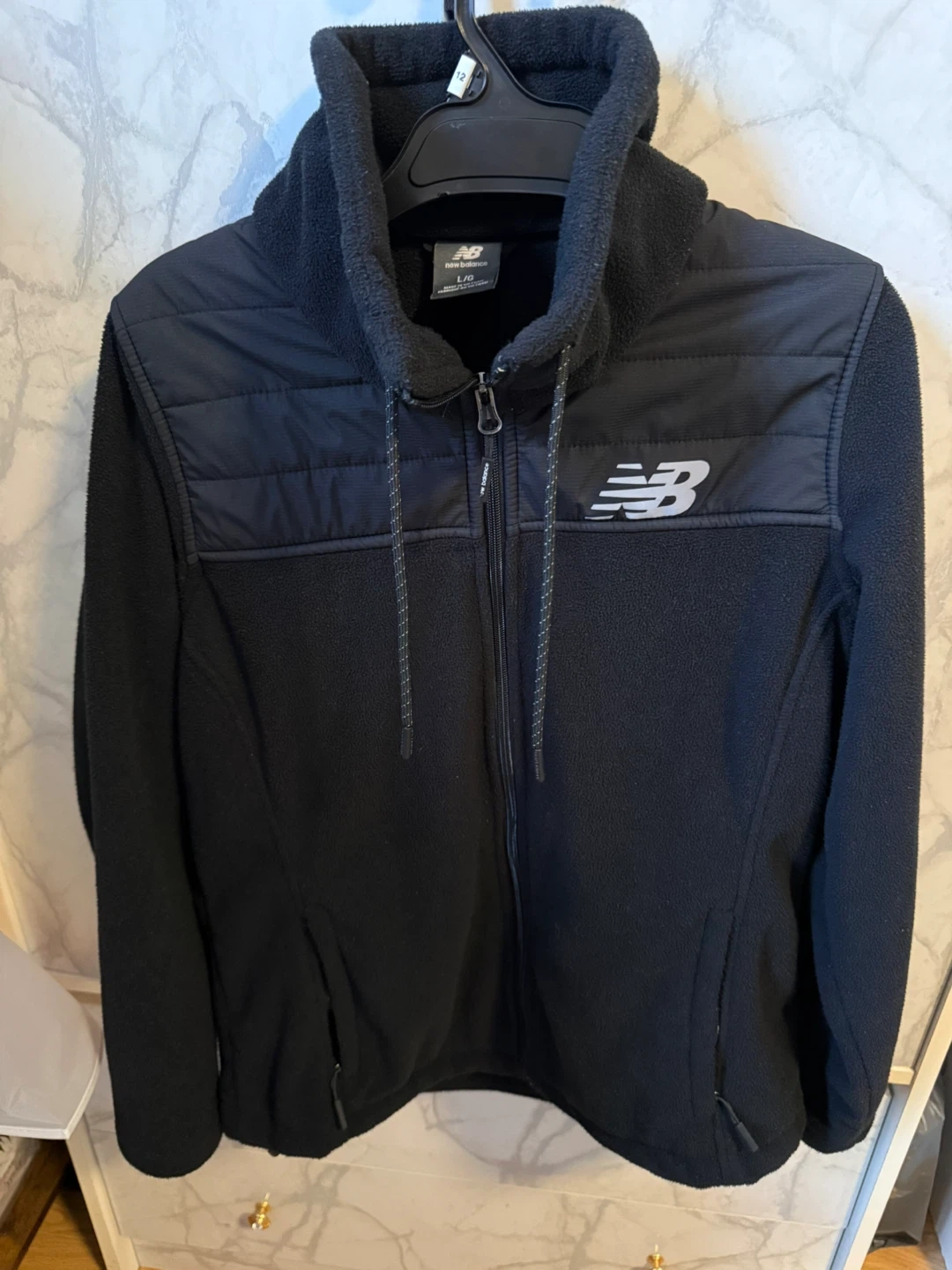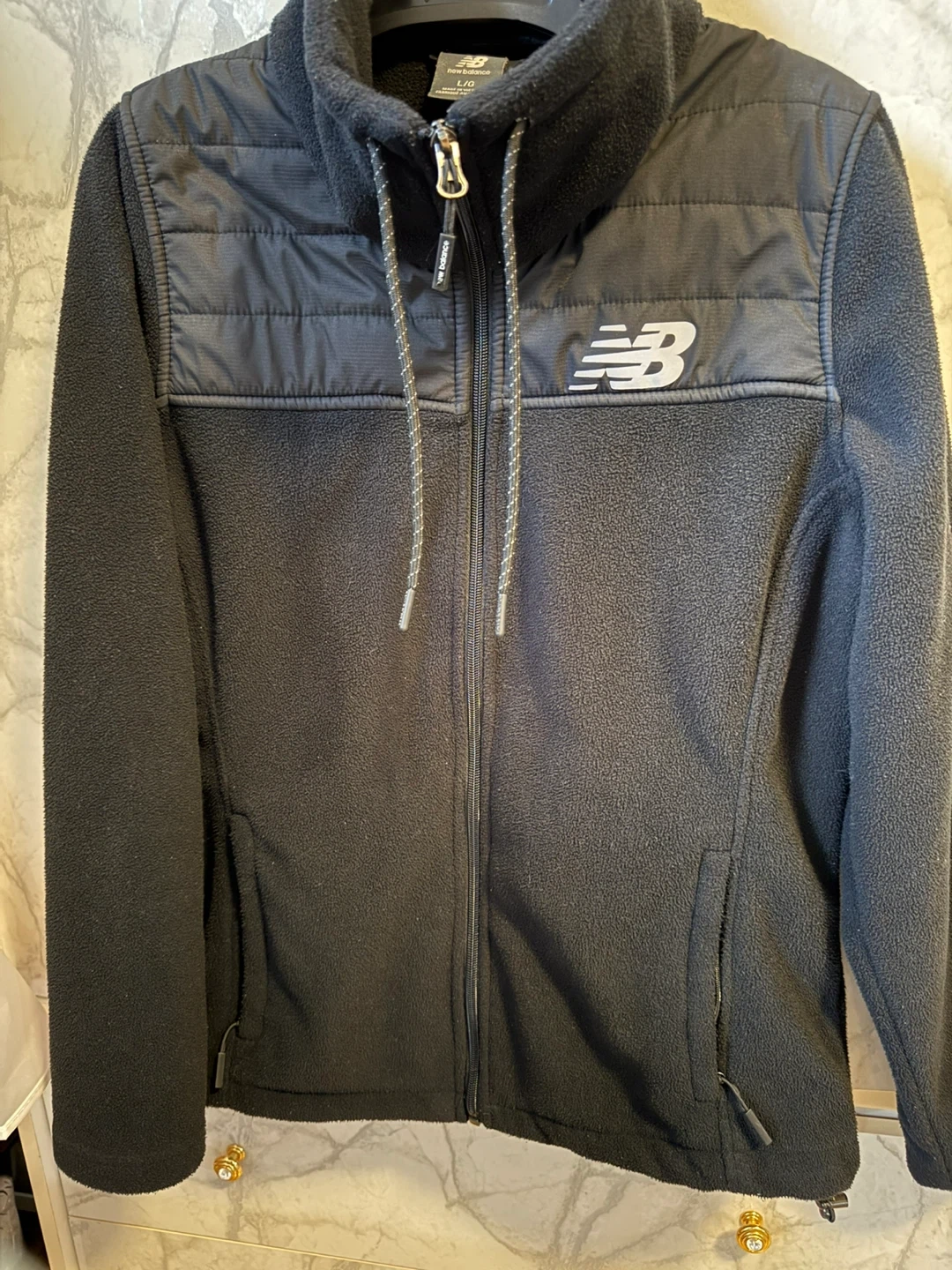 Black New Balance full-zip fleece jacket with a quilted chest panel. It's a size L/G. Great for layering during cooler weather! Perfect condition barely worn.