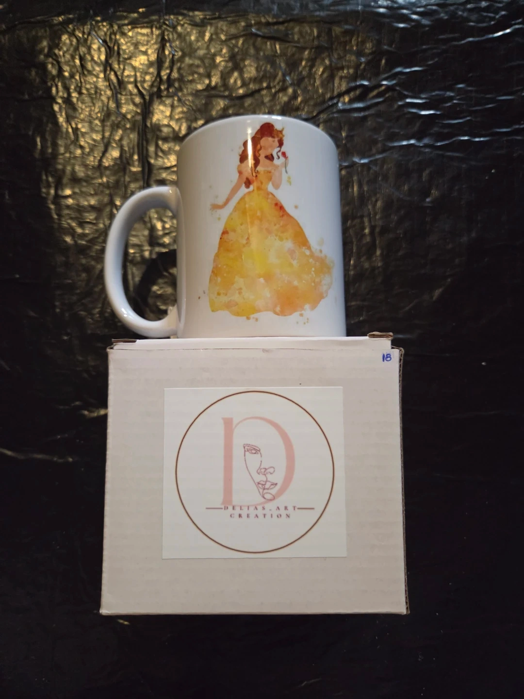 White ceramic mug featuring Princess Belle in her yellow ballgown. It comes with a gift box from Delta's Art Creation. This mug is perfect for enjoying your morning coffee or tea!