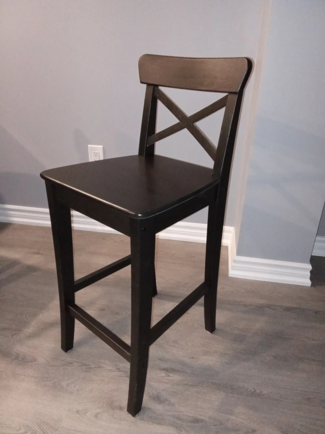 This is a dark brown IKEA Ingolf bar stool with a cross-back design. It measures 24 3/4" in height. The stool comes in its original box, ready for assembly.