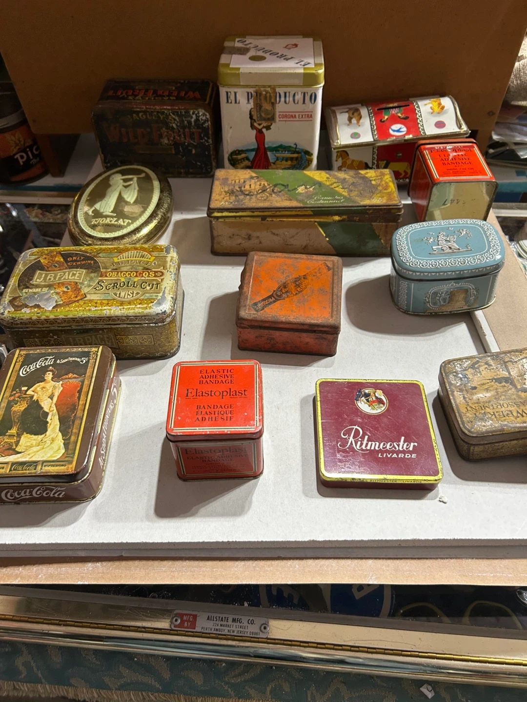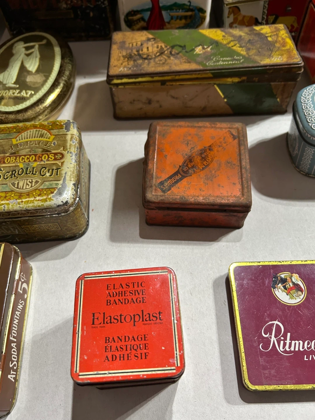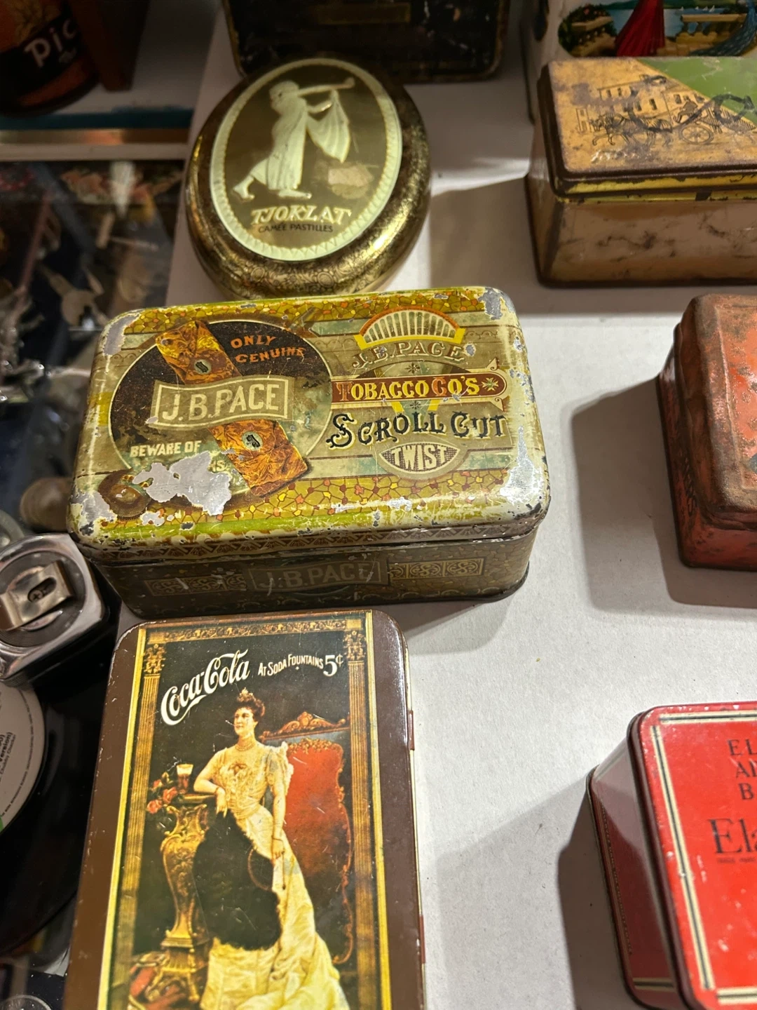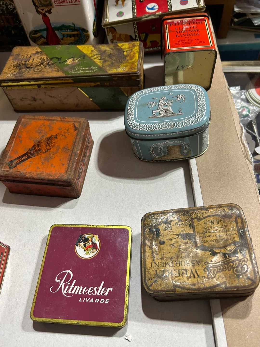 This is a collection of various vintage decorative tins. Tins include brands like J.B. Pace, Ritmeester, Elastoplast, and Coca-Cola. Each tin has unique historical designs and graphics from their era. They're great for collectors or for storing small items.