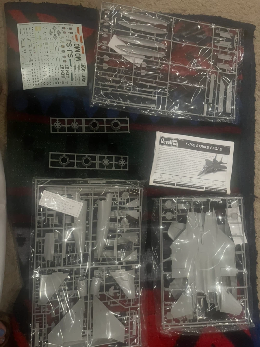 This is a Revell F-15E Strike Eagle model kit. It comes with all the plastic sprues, decals, and instructions for assembly. It's a 1:48 scale kit. A great project for aviation enthusiasts!