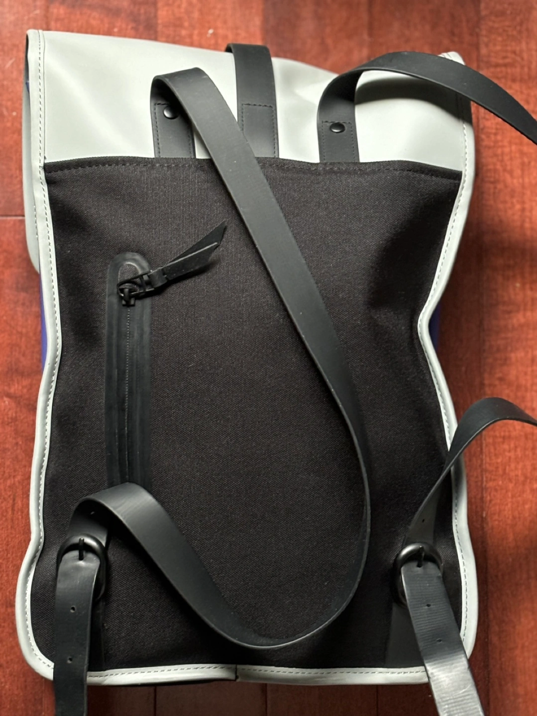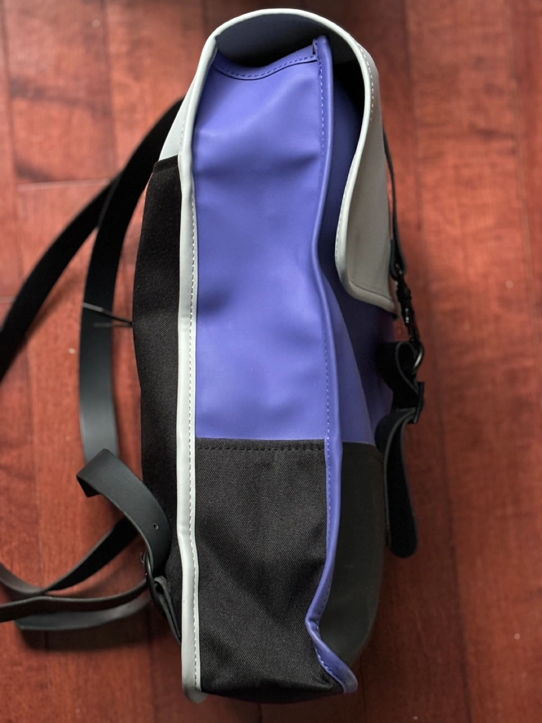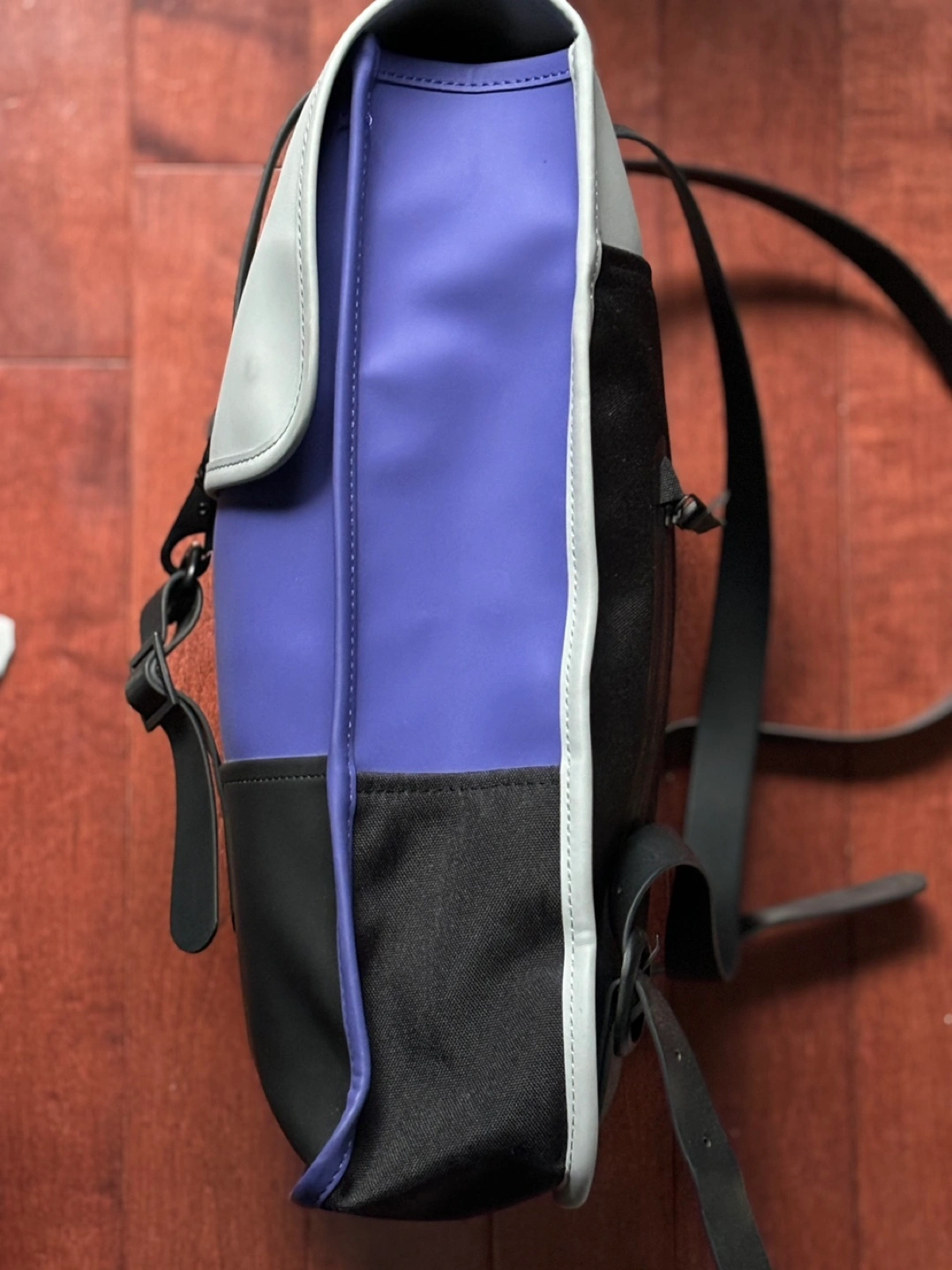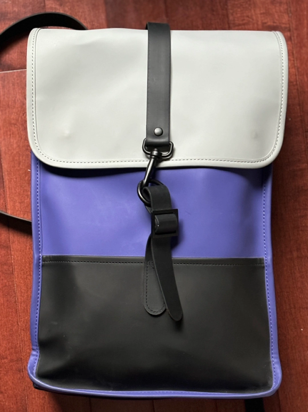 Rains Mini Backpack in colour blocked Purple, Grey and Black. Fits 13” laptop. No stains, one side of an interior pocket lining has come off but does not affect anything for the backpack overall.