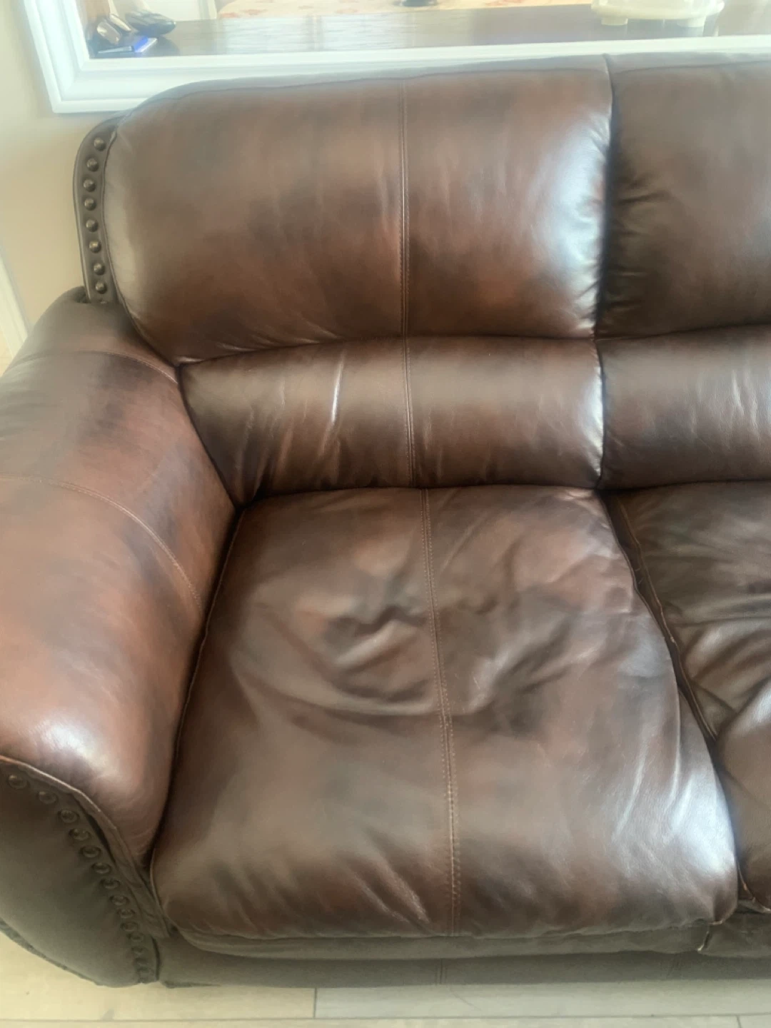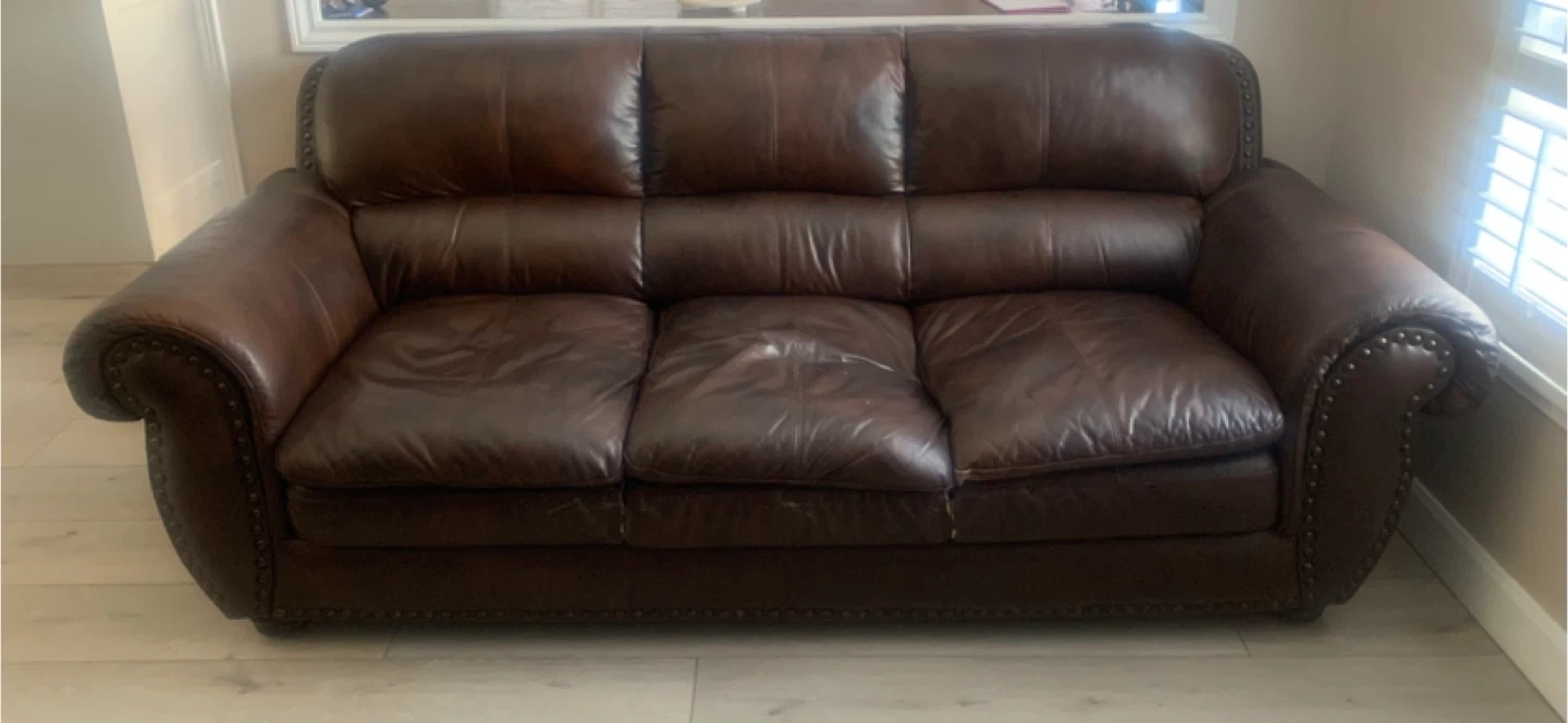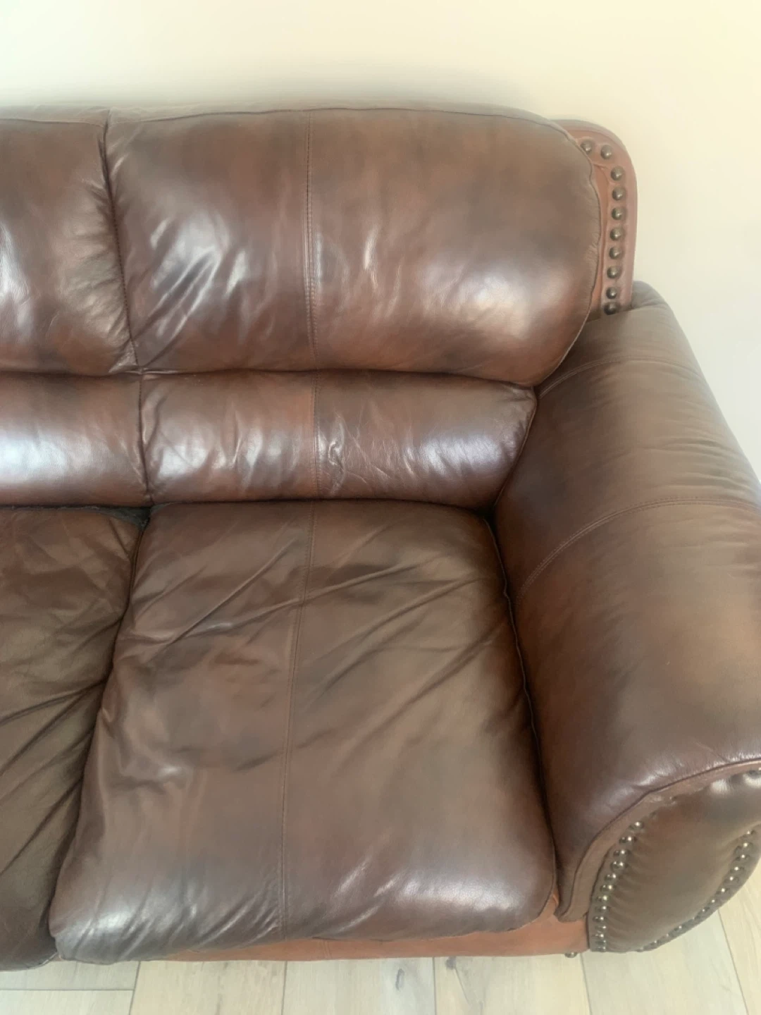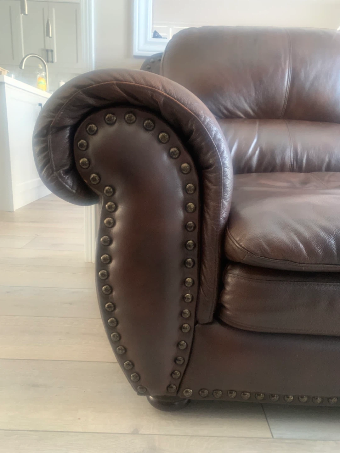 Two 3 seater Comfortable brown leather sofa. Classic design with studded accents on the arms. Made with genuine leather. Plenty of seating space for your family or guests!
