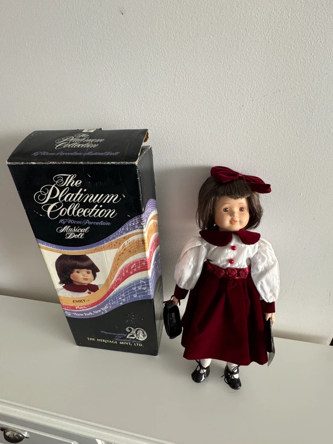 This is The Platinum Collection 16/40cm porcelain musical doll named Emily. It plays music and comes with the original box . The doll is dressed in a red velvet dress with a white ruffled blouse and a red bow in her hair. Pick up at Steeles & Bathurst area .