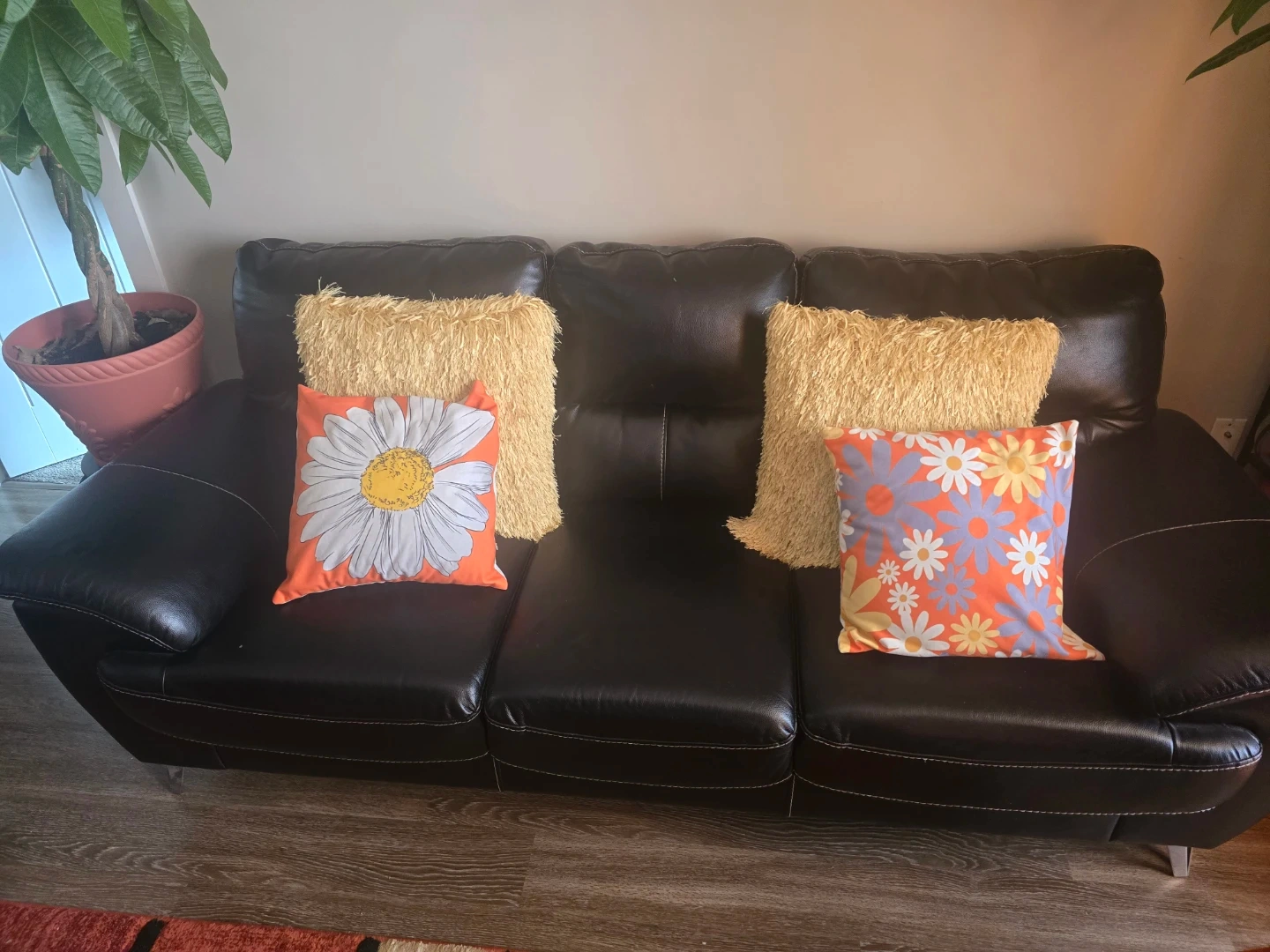 Two fun decorative throw pillows. One features a large daisy on an orange background, and the other has a pattern of small flowers on an orange and purple background. Both have a soft, shaggy texture on the back. They're great for adding a pop of colour to any room!