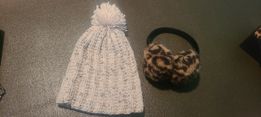 can be sold separately or together White knit hat for $3 Earmuffs for $4 Or both for $5