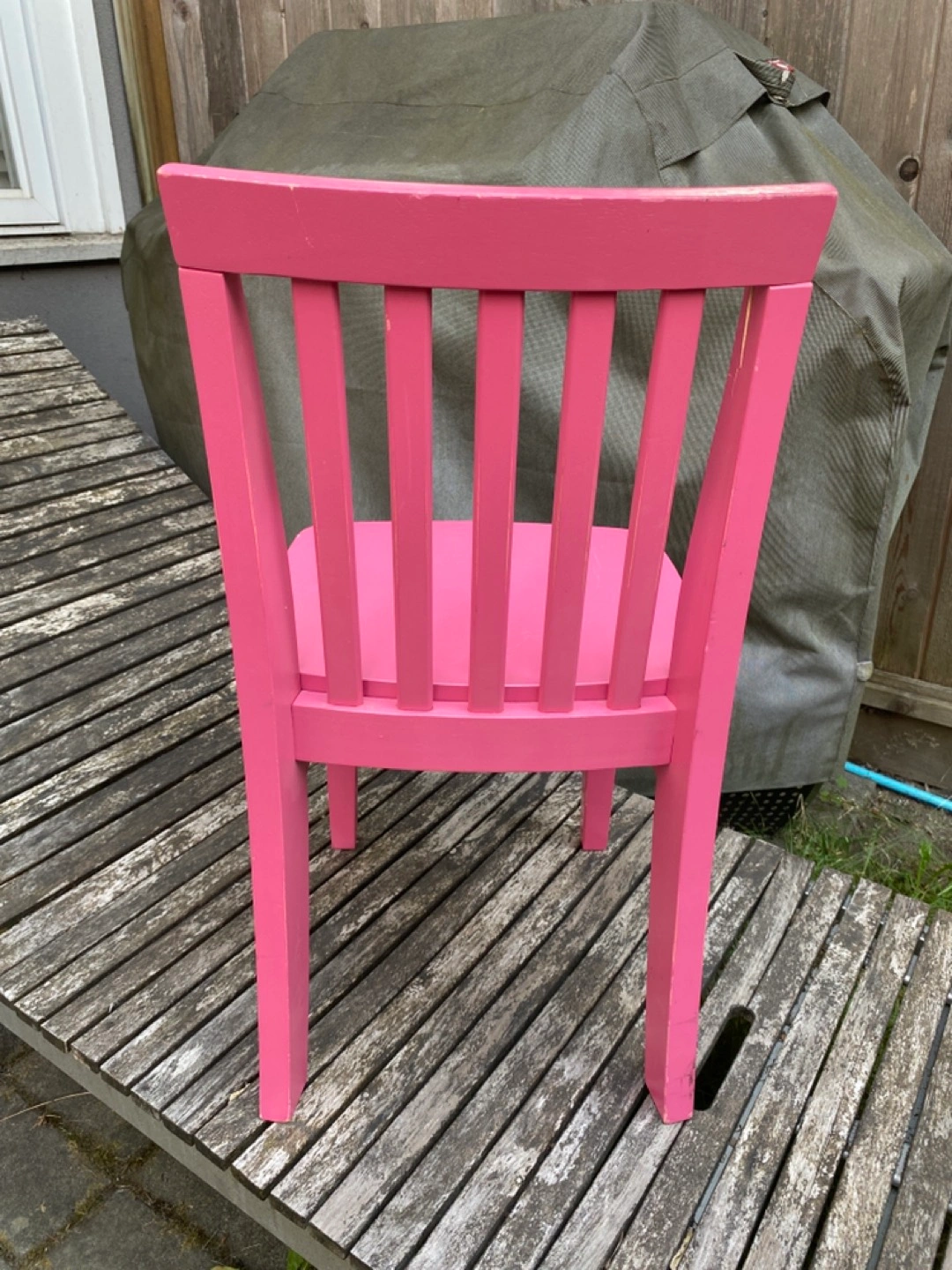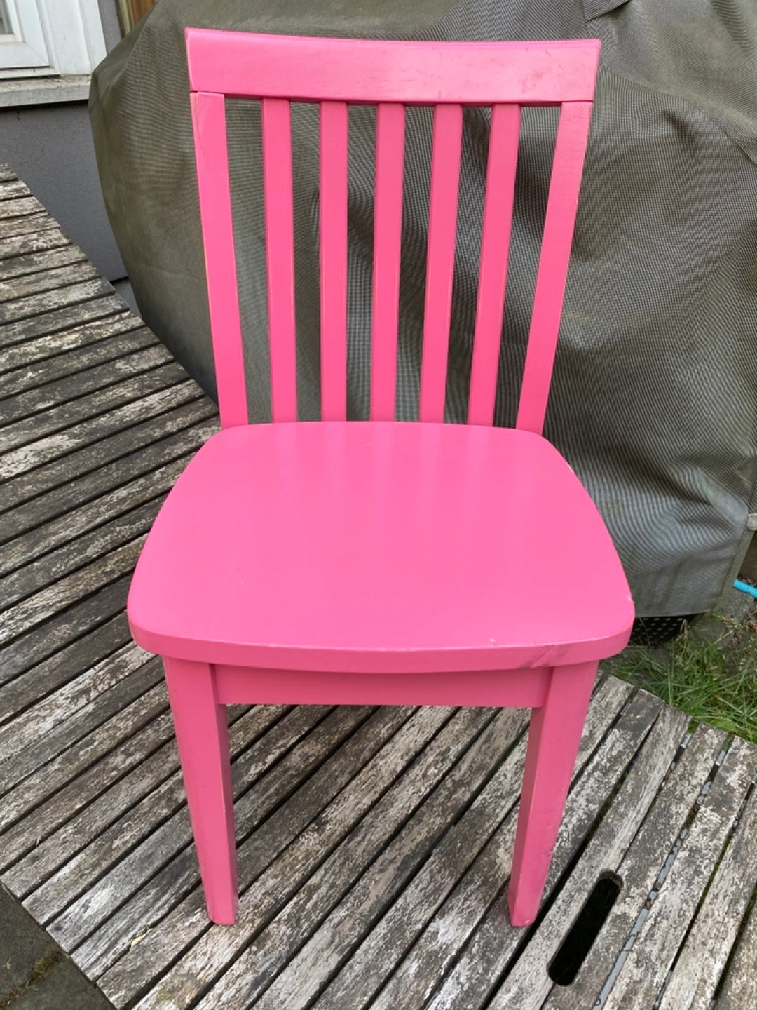 This bright pink Carolina Play Chair is made from solid wood and very sturdy. There is a crack in a slat but doesn’t affect the chair at all & could probably be glued together. We just never got around to it.