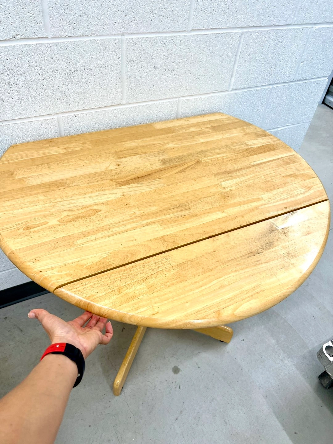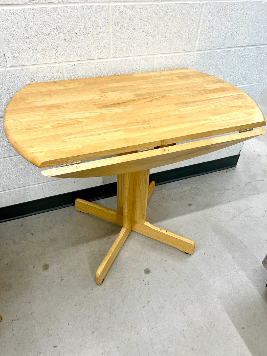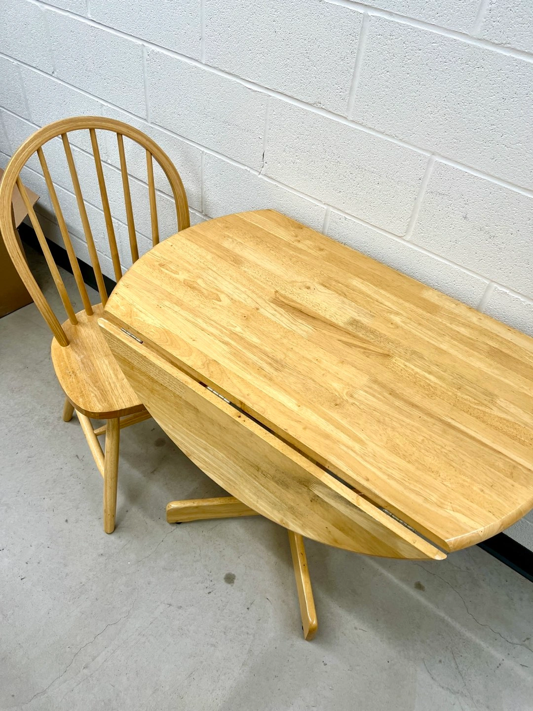 Beautiful solid pine folding table plus 1 free matching chair. The table expands to fully round top and seats 4 comfortably. It also folds to comfortable bistro table. Perfect kitchen table.