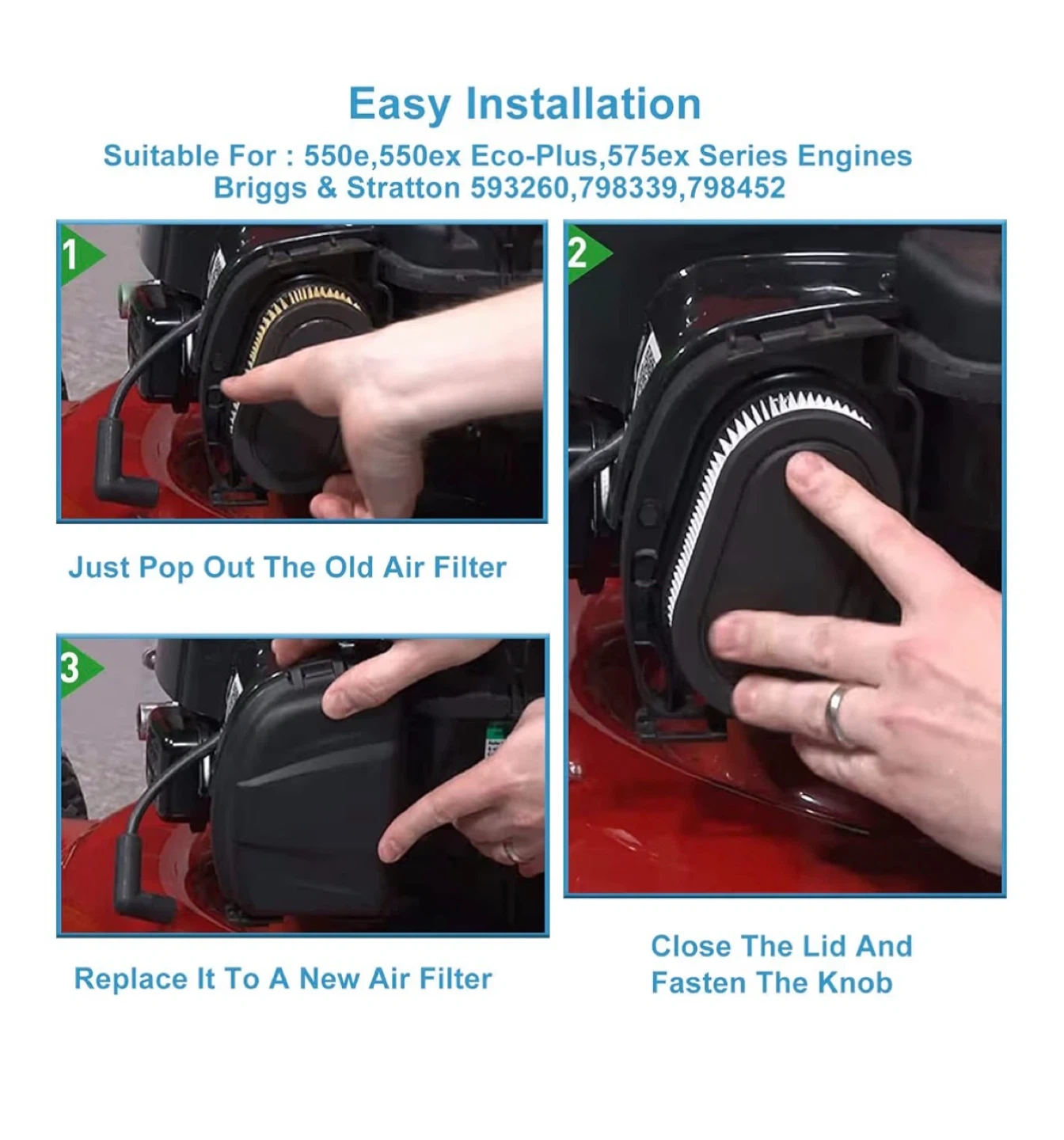 This is a 2-pack of replacement air filters for Briggs & Stratton 550e, 550ex, 575ex series engines. They're designed for easy installation, simply pop out the old filter and replace it with a new one. Fits Briggs & Stratton models 593260, 798339, and 798452.