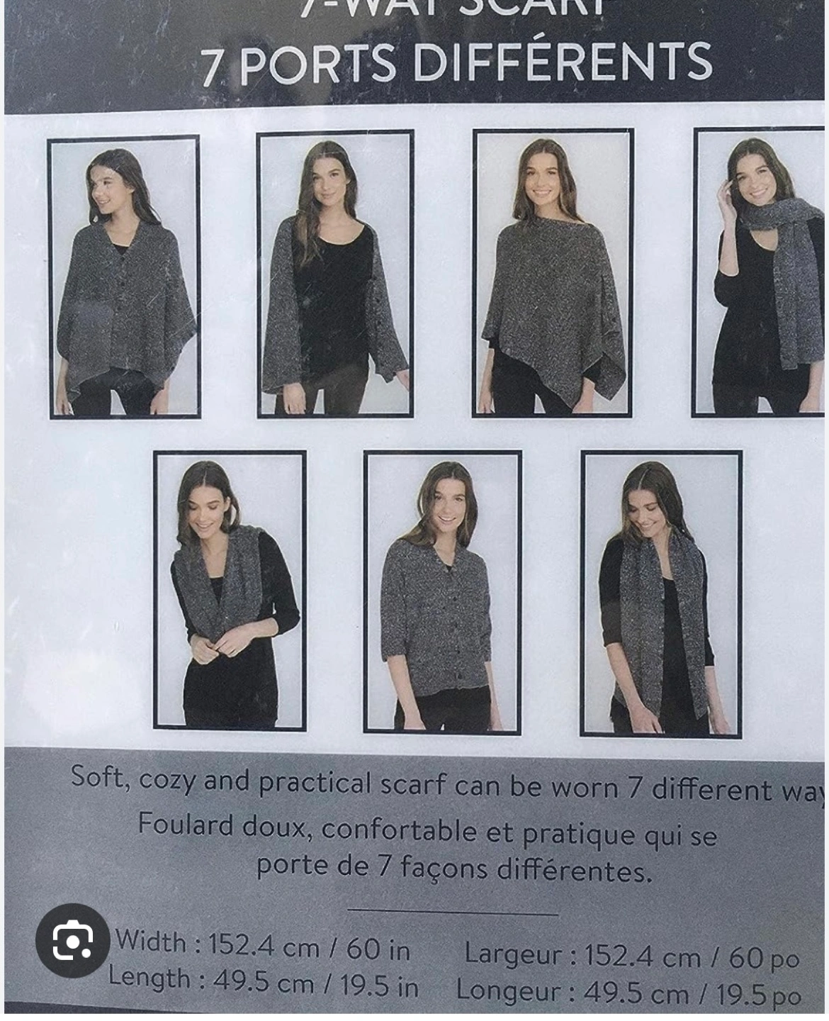 60inch by 19.5 inch brand new scarf that can be worn up to seven different ways!