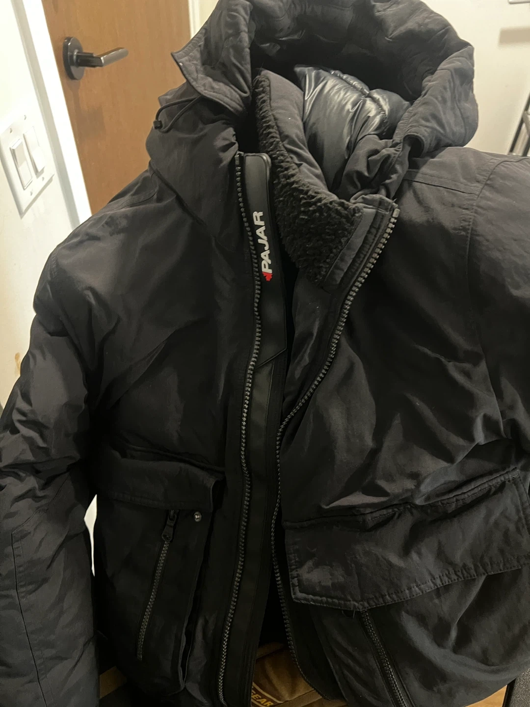 This is a Pajar winter bomber jacket in black. It's a size S/P. The jacket is made of durable material and features a cozy sherpa collar lining. It's designed for warmth and protection against the elements.